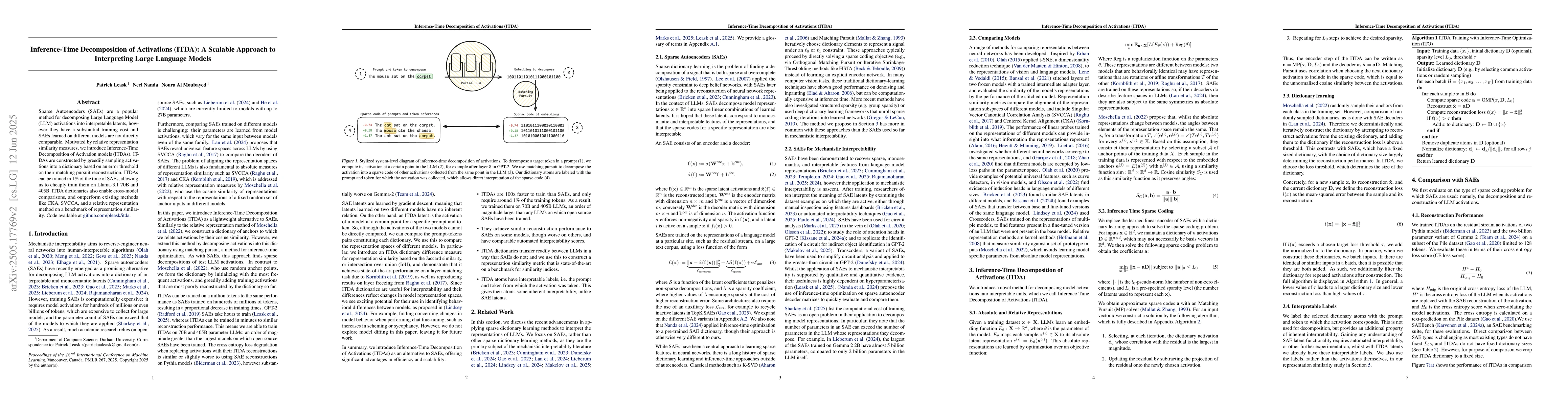 The paper introduces Inference-Time Decomposition of Activations (ITDA), a method for interpreting large language models that significantly reduces training time and data usage compared to Sparse Autoencoders (SAEs). ITDAs, constructed from a dictionary of language model activations, enable cross-model comparisons and outperform existing similarity metrics. Despite a slight performance penalty, ITDAs offer a cost-effective alternative for resource-limited scenarios or when comparing different models.