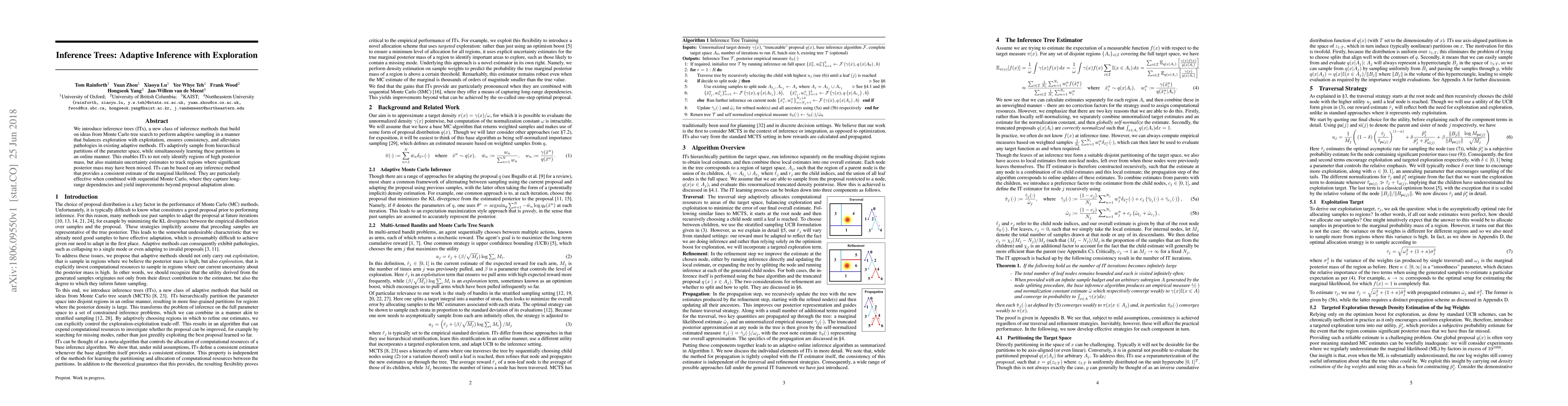 Inference trees (ITs) are a novel adaptive inference method that leverages Monte Carlo tree search for balanced exploration and exploitation, ensuring consistency and addressing issues in existing adaptive techniques. ITs adaptively sample from hierarchical parameter space partitions while learning these partitions online, enhancing uncertainty tracking and long-range dependency capture when used with sequential Monte Carlo.