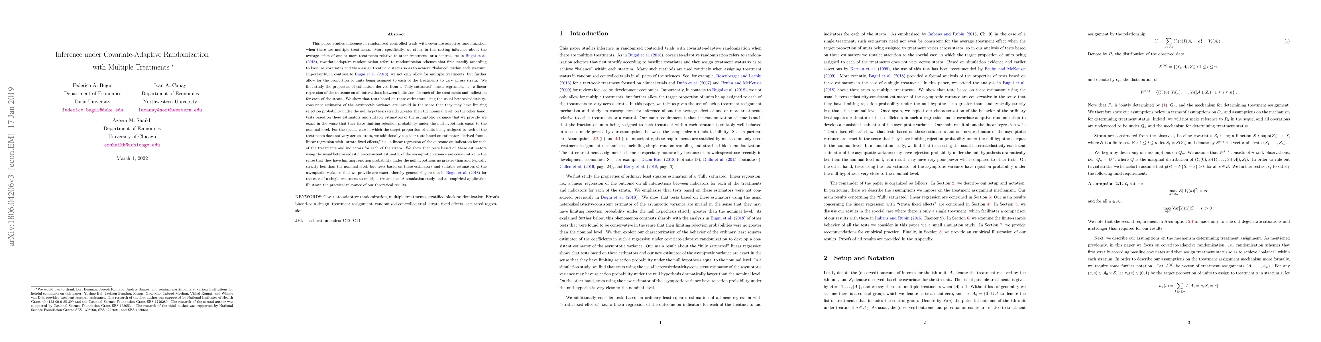 This paper examines inference in randomized controlled trials with covariate-adaptive randomization for multiple treatments, showing that traditional variance estimators are invalid but providing new estimators that yield exact tests. A simulation study demonstrates the practical implications of these findings.