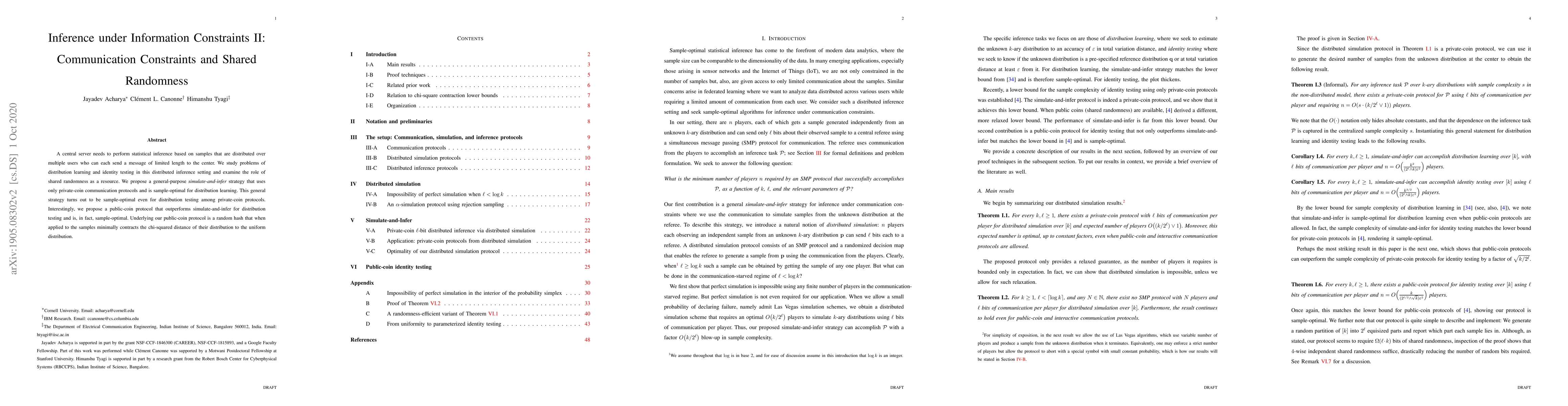 A central server needs to perform statistical inference based on samples that are distributed over multiple users who can each send a message of limited length to the center. We study problems of distribution learning and identity testing in this distributed inference setting and examine the role of shared randomness as a resource. We propose a general-purpose simulate-and-infer strategy that uses only private-coin communication protocols and is sample-optimal for distribution learning. This general strategy turns out to be sample-optimal even for distribution testing among private-coin protocols. Interestingly, we propose a public-coin protocol that outperforms simulate-and-infer for distribution testing and is, in fact, sample-optimal. Underlying our public-coin protocol is a random hash that when applied to the samples minimally contracts the chi-squared distance of their distribution to the uniform distribution.