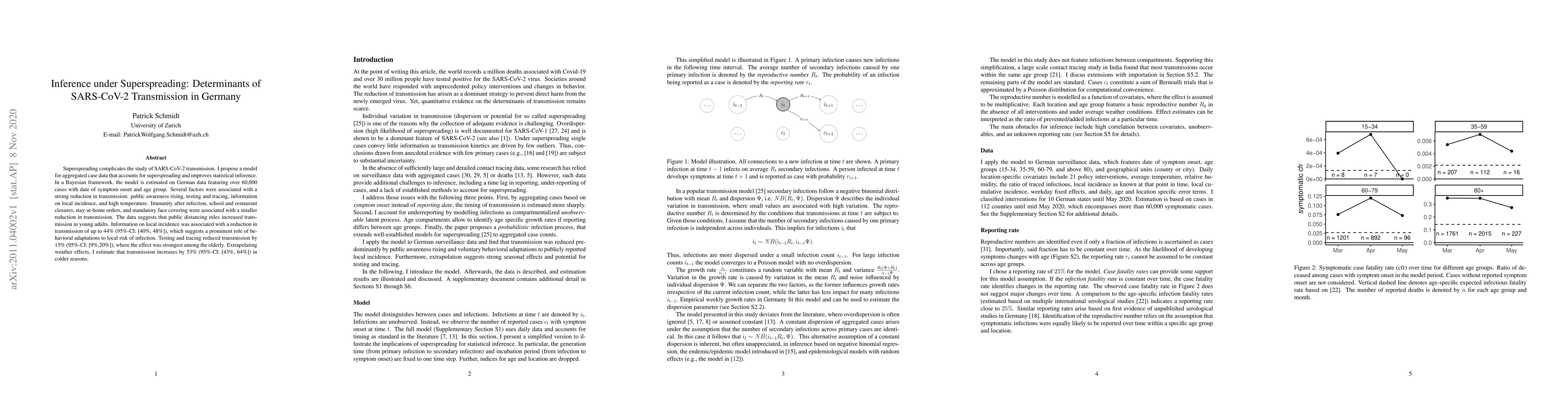 Superspreading complicates the study of SARS-CoV-2 transmission. I propose a model for aggregated case data that accounts for superspreading and improves statistical inference. In a Bayesian framework, the model is estimated on German data featuring over 60,000 cases with date of symptom onset and age group. Several factors were associated with a strong reduction in transmission: public awareness rising, testing and tracing, information on local incidence, and high temperature. Immunity after infection, school and restaurant closures, stay-at-home orders, and mandatory face covering were associated with a smaller reduction in transmission. The data suggests that public distancing rules increased transmission in young adults. Information on local incidence was associated with a reduction in transmission of up to 44% (95%-CI: [40%, 48%]), which suggests a prominent role of behavioral adaptations to local risk of infection. Testing and tracing reduced transmission by 15% (95%-CI: [9%,20%]), where the effect was strongest among the elderly. Extrapolating weather effects, I estimate that transmission increases by 53% (95%-CI: [43%, 64%]) in colder seasons.