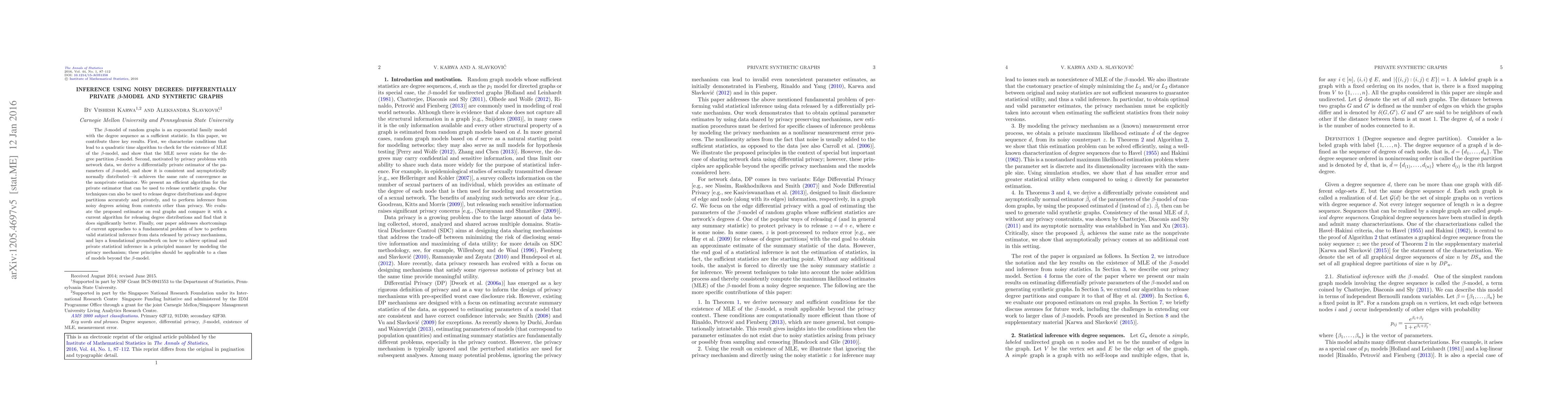 The $\beta$-model of random graphs is an exponential family model with the degree sequence as a sufficient statistic. In this paper, we contribute three key results. First, we characterize conditions that lead to a quadratic time algorithm to check for the existence of MLE of the $\beta$-model, and show that the MLE never exists for the degree partition $\beta$-model. Second, motivated by privacy problems with network data, we derive a differentially private estimator of the parameters of $\beta$-model, and show it is consistent and asymptotically normally distributed - it achieves the same rate of convergence as the nonprivate estimator. We present an efficient algorithm for the private estimator that can be used to release synthetic graphs. Our techniques can also be used to release degree distributions and degree partitions accurately and privately, and to perform inference from noisy degrees arising from contexts other than privacy. We evaluate the proposed estimator on real graphs and compare it with a current algorithm for releasing degree distributions and find that it does significantly better. Finally, our paper addresses shortcomings of current approaches to a fundamental problem of how to perform valid statistical inference from data released by privacy mechanisms, and lays a foundational groundwork on how to achieve optimal and private statistical inference in a principled manner by modeling the privacy mechanism; these principles should be applicable to a class of models beyond the $\beta$-model.