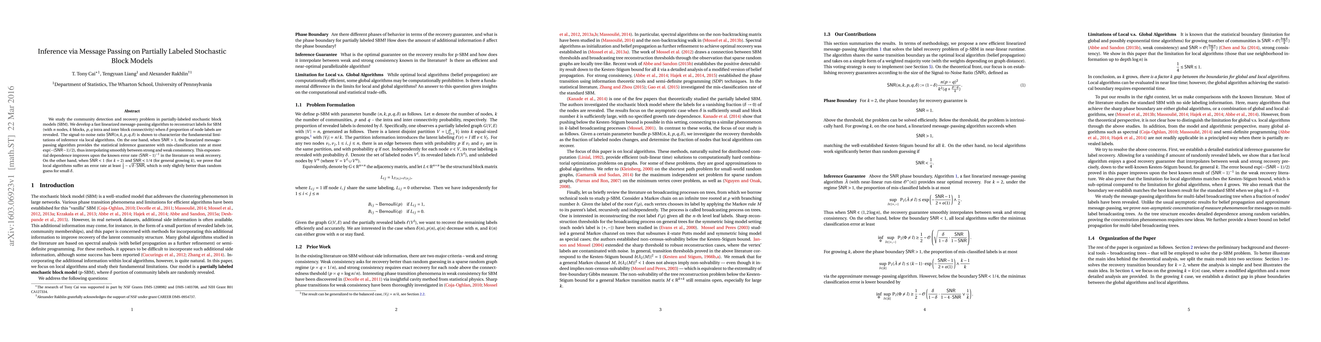 We study the community detection and recovery problem in partially-labeled stochastic block models (SBM). We develop a fast linearized message-passing algorithm to reconstruct labels for SBM (with $n$ nodes, $k$ blocks, $p,q$ intra and inter block connectivity) when $\delta$ proportion of node labels are revealed. The signal-to-noise ratio ${\sf SNR}(n,k,p,q,\delta)$ is shown to characterize the fundamental limitations of inference via local algorithms. On the one hand, when ${\sf SNR}>1$, the linearized message-passing algorithm provides the statistical inference guarantee with mis-classification rate at most $\exp(-({\sf SNR}-1)/2)$, thus interpolating smoothly between strong and weak consistency. This exponential dependence improves upon the known error rate $({\sf SNR}-1)^{-1}$ in the literature on weak recovery. On the other hand, when ${\sf SNR}<1$ (for $k=2$) and ${\sf SNR}<1/4$ (for general growing $k$), we prove that local algorithms suffer an error rate at least $\frac{1}{2} - \sqrt{\delta \cdot {\sf SNR}}$, which is only slightly better than random guess for small $\delta$.