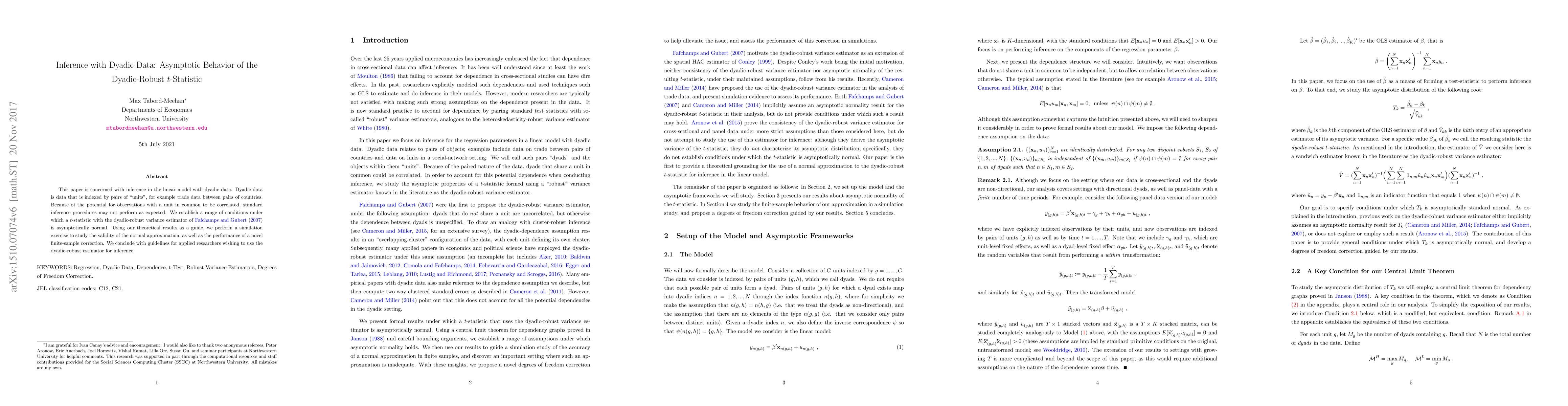 This paper investigates the asymptotic behavior of the dyadic-robust t-statistic for linear models with dyadic data, establishing conditions for its asymptotic normality, and evaluates its performance through simulations and finite-sample corrections, providing guidelines for applied researchers.