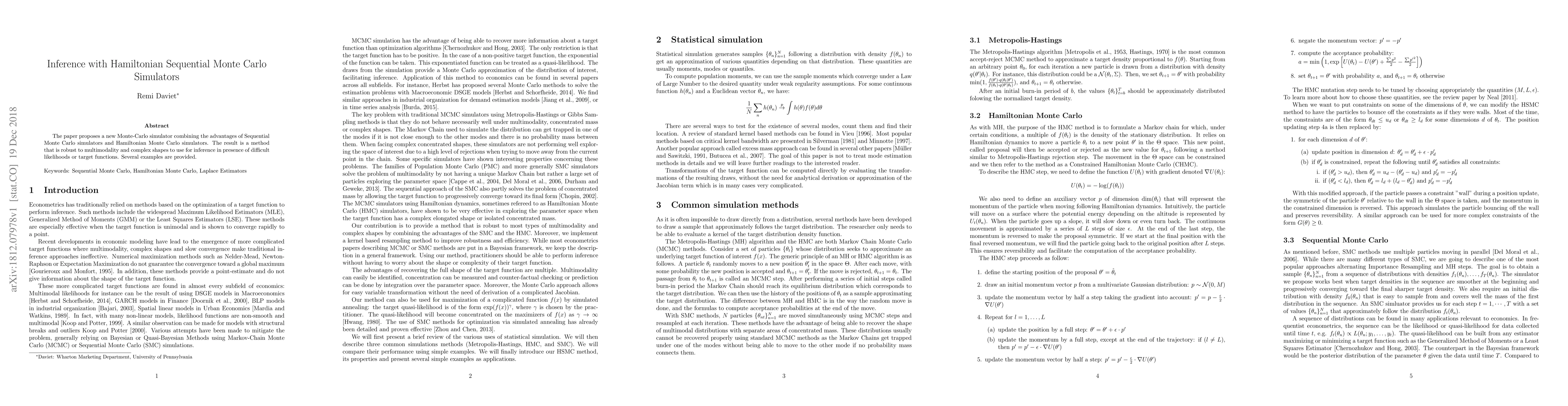 The paper introduces a hybrid Monte-Carlo simulator that merges Sequential Monte Carlo and Hamiltonian Monte Carlo techniques, offering robustness for multimodal and complex shapes, and demonstrating its efficacy through various examples.