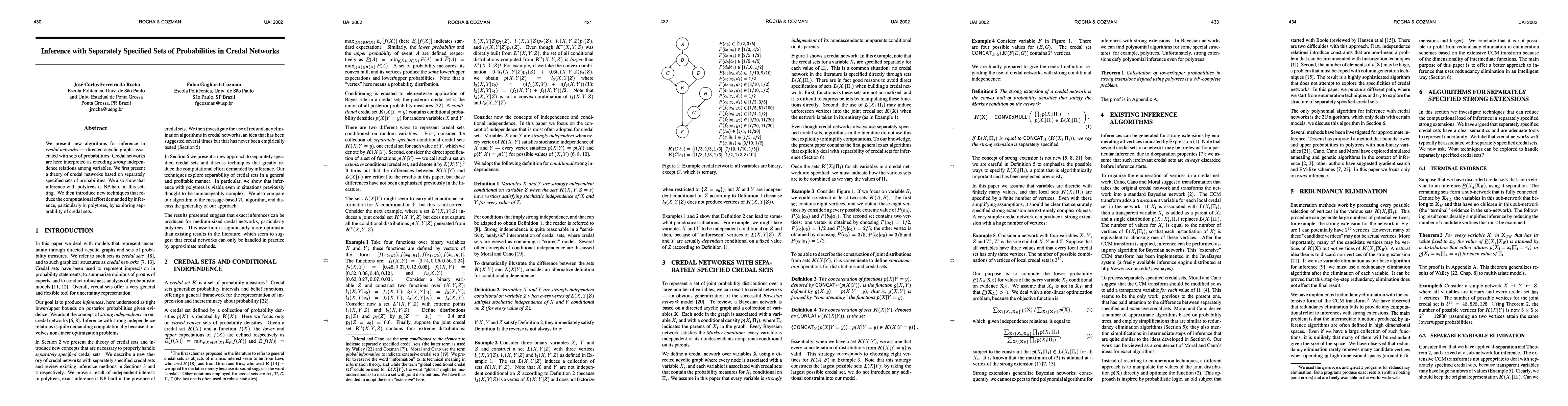 This paper introduces new algorithms for inference in credal networks, which represent directed acyclic graphs with sets of probabilities encoding strong independence relations. It demonstrates that inference in polytrees within these networks is NP-hard and proposes new techniques to reduce computational effort by exploiting the separability of credal sets.