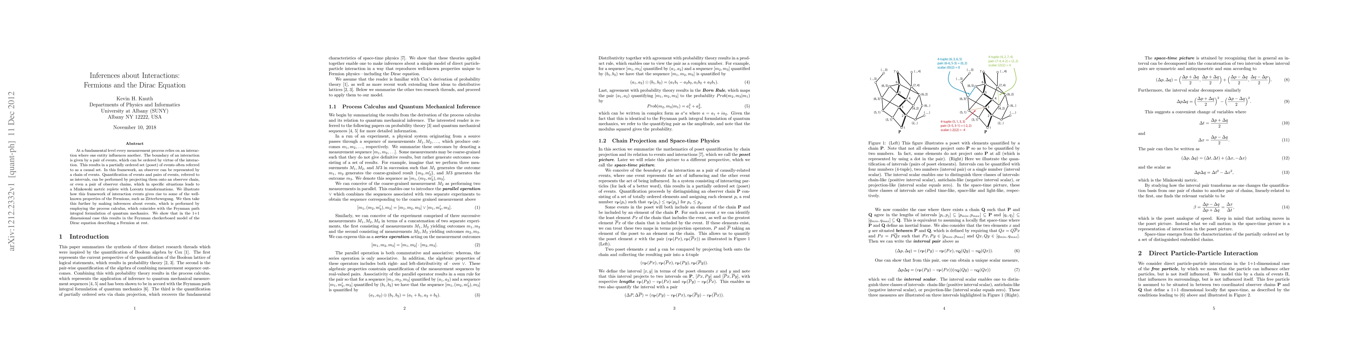 At a fundamental level every measurement process relies on an interaction where one entity influences another. The boundary of an interaction is given by a pair of events, which can be ordered by virtue of the interaction. This results in a partially ordered set (poset) of events often referred to as a causal set. In this framework, an observer can be represented by a chain of events. Quantification of events and pairs of events, referred to as intervals, can be performed by projecting them onto an observer chain, or even a pair of observer chains, which in specific situations leads to a Minkowski metric replete with Lorentz transformations. We illustrate how this framework of interaction events gives rise to some of the well-known properties of the Fermions, such as Zitterbewegung. We then take this further by making inferences about events, which is performed by employing the process calculus, which coincides with the Feynman path integral formulation of quantum mechanics. We show that in the 1+1 dimensional case this results in the Feynman checkerboard model of the Dirac equation describing a Fermion at rest.