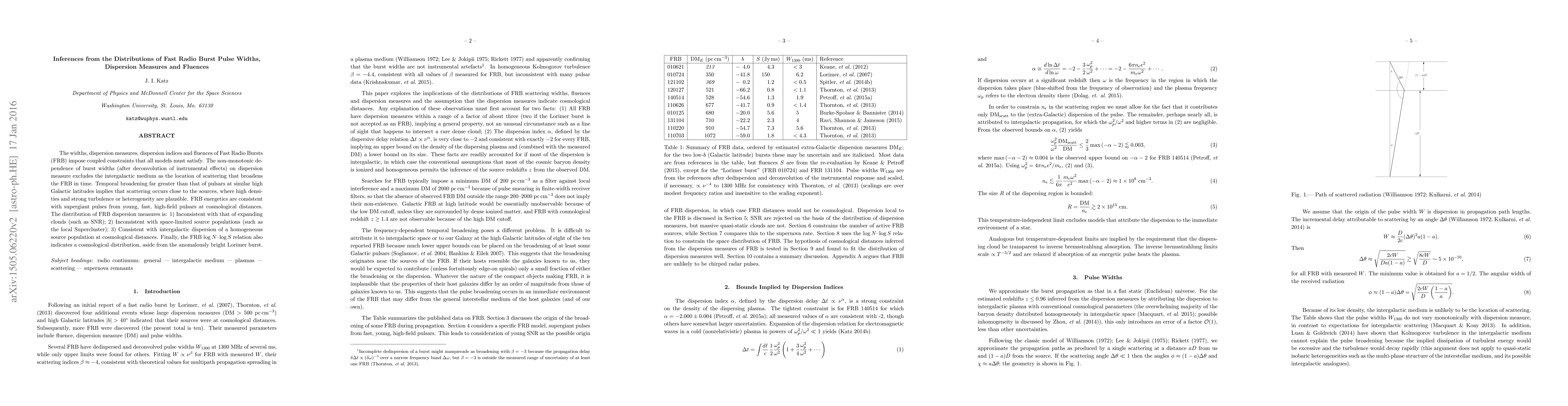 The widths, dispersion measures, dispersion indices and fluences of Fast Radio Bursts (FRB) impose coupled constraints that all models must satisfy. Observation of dispersion indices close to their low density limit of $-2$ sets a model-independent upper bound on the electron density and a lower bound on the size of any dispersive plasma cloud. The non-monotonic dependence of burst widths (after deconvolution of instrumental effects) on dispersion measure excludes the intergalactic medium as the location of scattering that broadens the FRB in time. Temporal broadening far greater than that of pulsars at similar high Galactic latitudes implies that scattering occurs close to the sources, where high densities and strong turbulence are plausible. FRB energetics are consistent with supergiant pulses from young, fast, high-field pulsars at cosmological distances. The distribution of FRB dispersion measures is inconsistent with expanding clouds (such as SNR). It excludes space-limited distributions (such as the local supercluster), but agrees with a homogeneous cosmological distribution with intergalactic dispersion. The FRB $\log{N}$--$\log{S}$ relation also indicates a cosmological distribution, aside from the anomalously bright Lorimer burst.