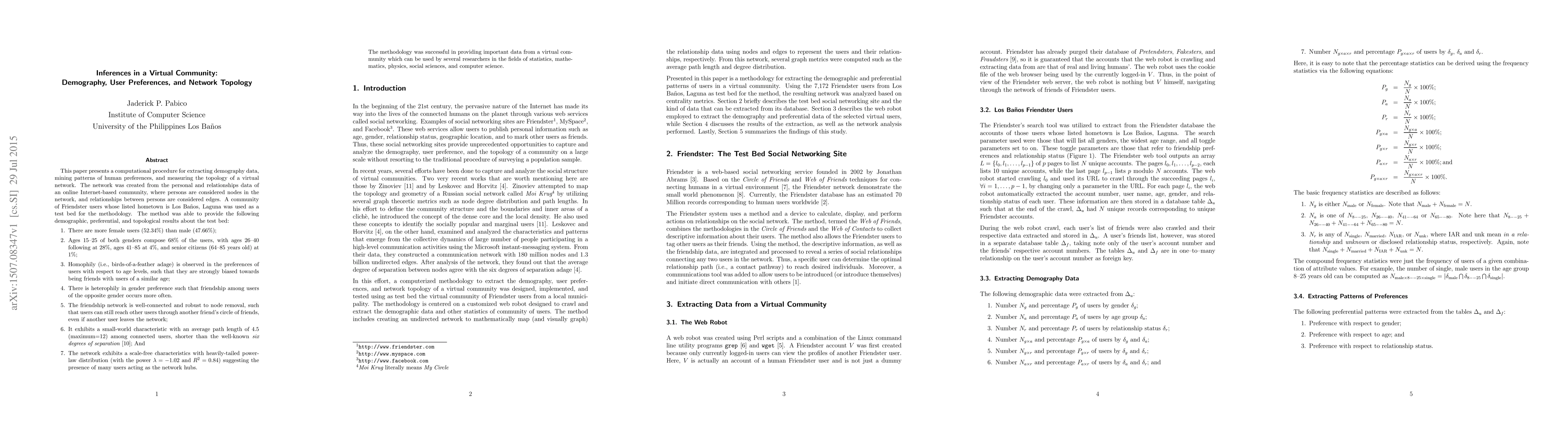 This paper presents a computational procedure for extracting demography data, mining patterns of human preferences, and measuring the topology of a virtual network. The network was created from the personal and relationships data of an online Internet-based community, where persons are considered nodes in the network, and relationships between persons are considered edges. A community of Friendster users whose listed hometown is Los Ba\~nos, Laguna was used as a test bed for the methodology. The method was able to provide the following demographic, preferential, and topological results about the test bed: (1) There are more female users (52.34\%) than male (47.66\%); (2) Homophily (i.e., birds-of-a-feather adage) is observed in the preferences of users with respect to age levels, such that they are strongly biased towards being friends with users of a similar age; (3) There is heterophily in gender preference such that friendship among users of the opposite gender occurs more often. (4) It exhibits a small-world characteristic with an average path length of 4.5 (maximum=12) among connected users, shorter than the well-known {\em six degrees of separation}~\cite{travers69}; And (5) The network exhibits a scale-free characteristics with heavily-tailed power-law distribution (with the power $\lambda = -1.02$ and $R^2 = 0.84$) suggesting the presence of many users acting as the network hubs. The methodology was successful in providing important data from a virtual community which can be used by several researchers in the fields of statistics, mathematics, physics, social sciences, and computer science.
