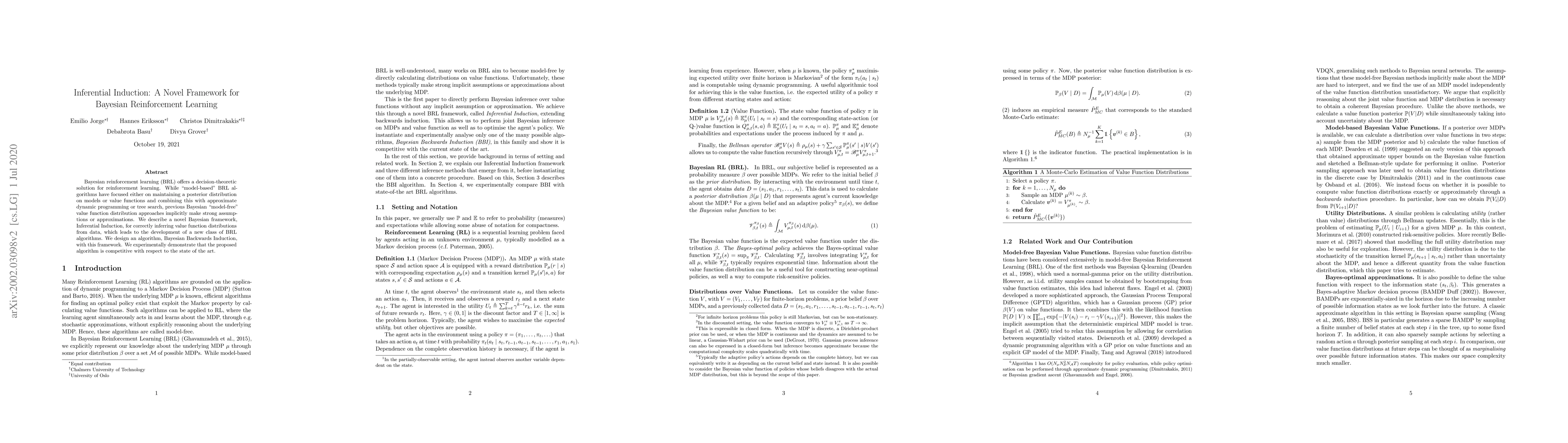 The paper introduces Inferential Induction, a novel Bayesian framework for reinforcement learning, which accurately infers value function distributions from data. The proposed Bayesian Backwards Induction algorithm, developed within this framework, is shown to be competitive with state-of-the-art methods.