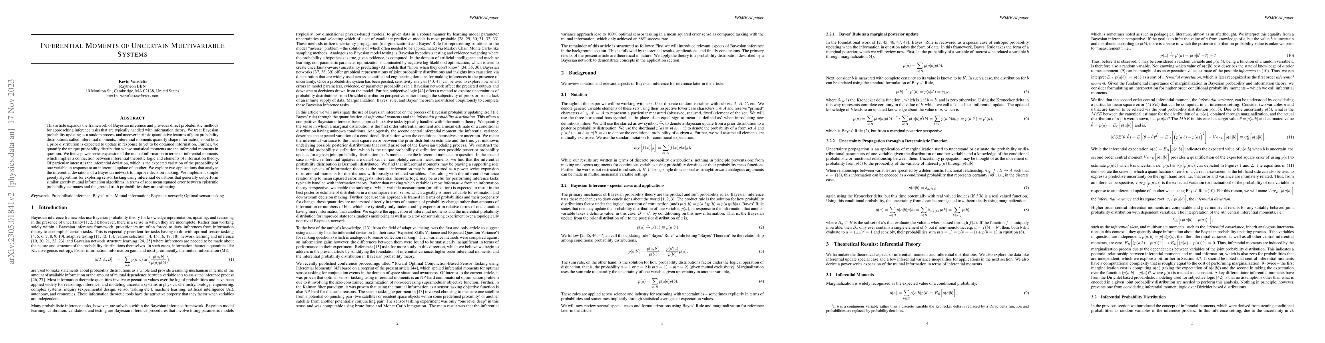 This paper introduces inferential moments as a novel framework for Bayesian inference, providing probabilistic methods to quantify how prior distributions update with new information. It demonstrates applications in Bayesian networks and sensor tasking, showing improved decision-making and performance over mutual information-based algorithms.
