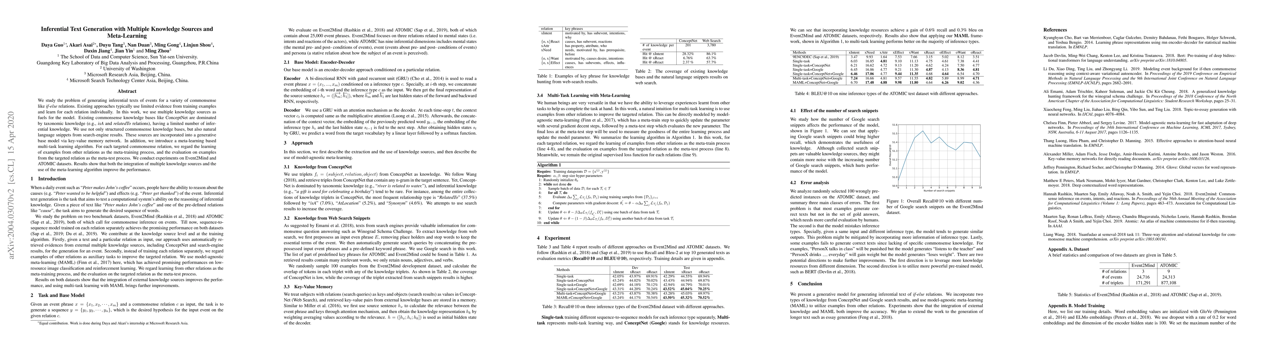 This paper proposes an inferential text generation model that leverages multiple knowledge sources, including structured commonsense databases and natural language snippets, to enhance text generation for commonsense if-else relations. It employs a meta-learning based multi-task learning approach to improve performance, demonstrating better results on Event2Mind and ATOMIC datasets.
