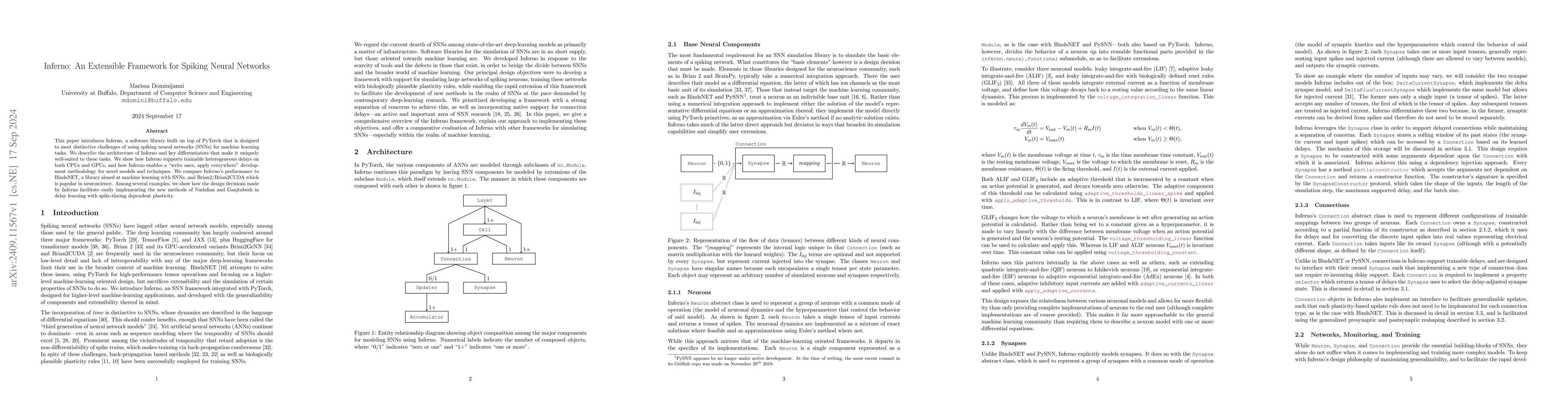 Inferno is a PyTorch-based framework for spiking neural networks, supporting trainable heterogeneous delays on CPUs and GPUs, and enabling a "write once, apply everywhere" development methodology. It compares favorably in performance to other SNN libraries like BindsNET and Brian2/Brian2CUDA, especially facilitating new delay learning techniques.