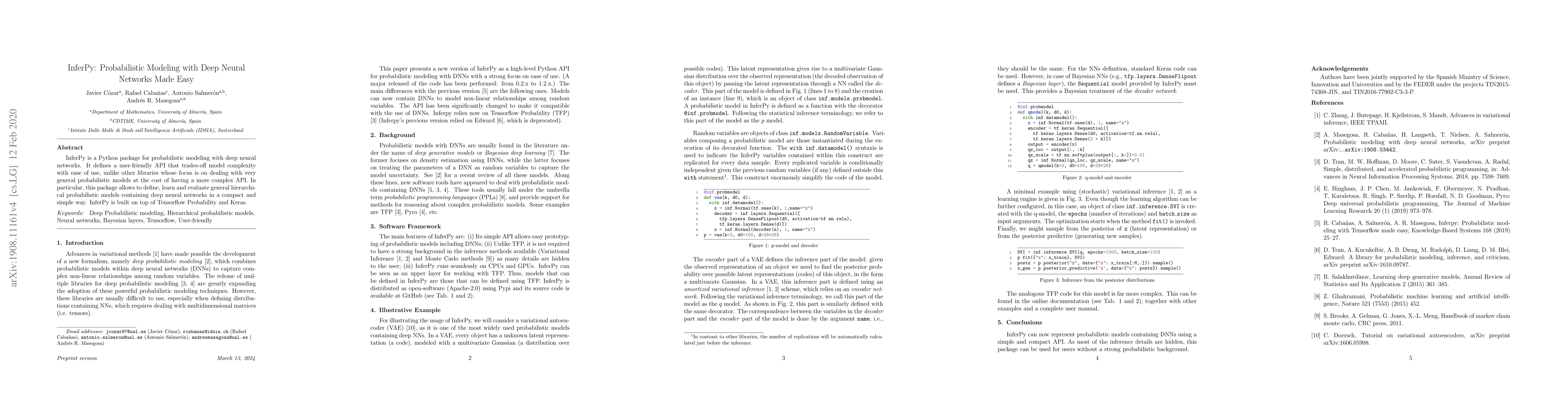 Summary: InferPy is a Python library designed to simplify probabilistic modeling with deep neural networks, offering an easy-to-use API for defining and evaluating hierarchical models, built on TensorFlow Probability and Keras. It balances model complexity with user-friendliness.