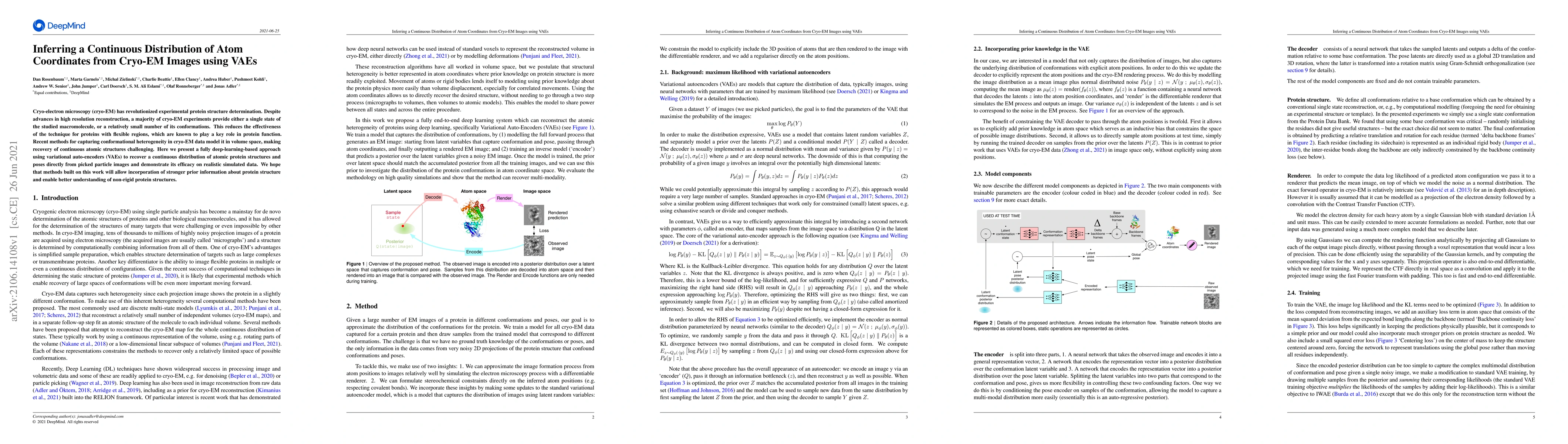 This paper proposes a deep-learning approach using variational auto-encoders (VAEs) to infer a continuous distribution of atomic coordinates from cryo-EM images, addressing the challenge of capturing conformational heterogeneity in protein structures. The method demonstrates effectiveness on simulated data, aiming to enhance the understanding of flexible protein regions.