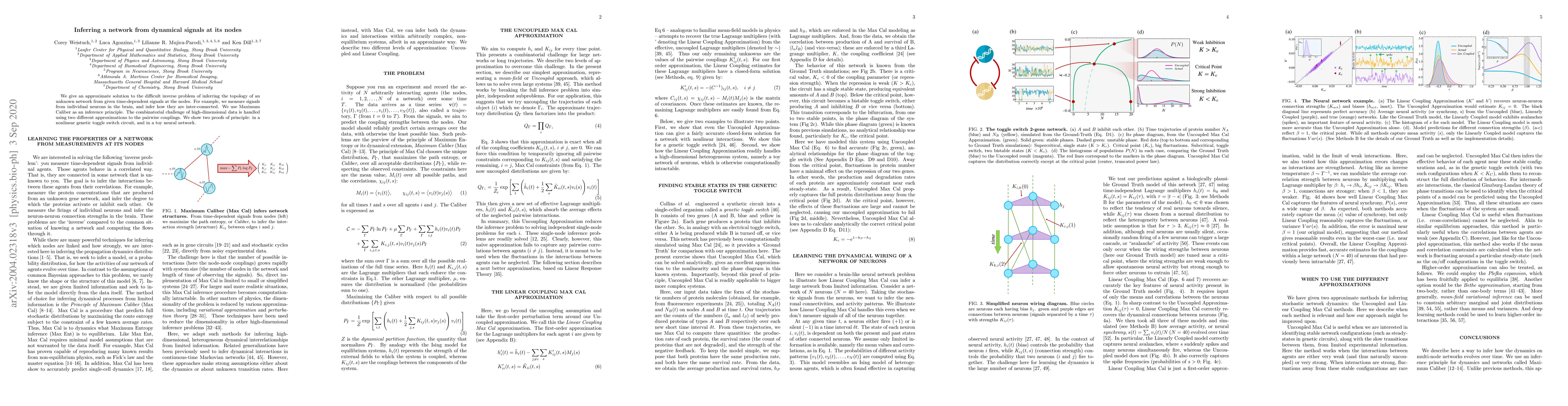 We give an approximate solution to the difficult inverse problem of inferring the topology of an unknown network from given time-dependent signals at the nodes. For example, we measure signals from individual neurons in the brain, and infer how they are inter-connected. We use Maximum Caliber as an inference principle. The combinatorial challenge of high-dimensional data is handled using two different approximations to the pairwise couplings. We show two proofs of principle: in a nonlinear genetic toggle switch circuit, and in a toy neural network.