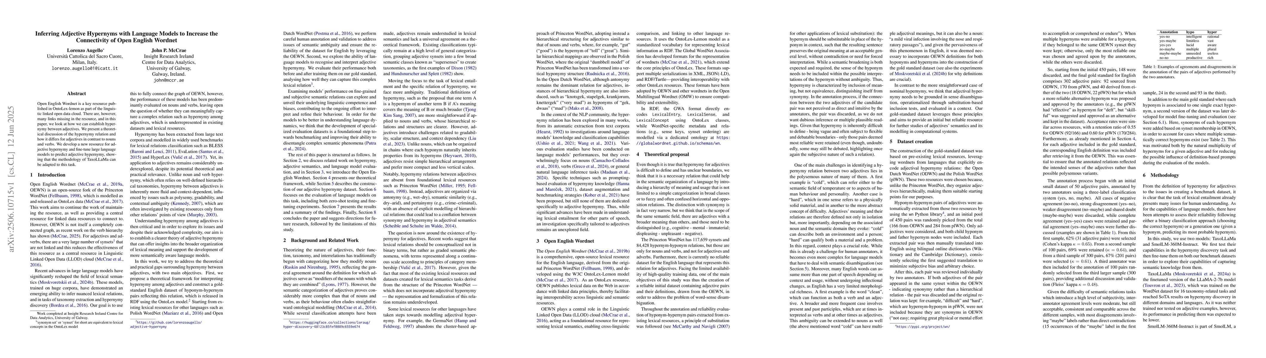 Open English Wordnet is a key resource published in OntoLex-lemon as part of the linguistic linked open data cloud. There are, however, many links missing in the resource, and in this paper, we look at how we can establish hypernymy between adjectives. We present a theoretical discussion of the hypernymy relation and how it differs for adjectives in contrast to nouns and verbs. We develop a new resource for adjective hypernymy and fine-tune large language models to predict adjective hypernymy, showing that the methodology of TaxoLLaMa can be adapted to this task.