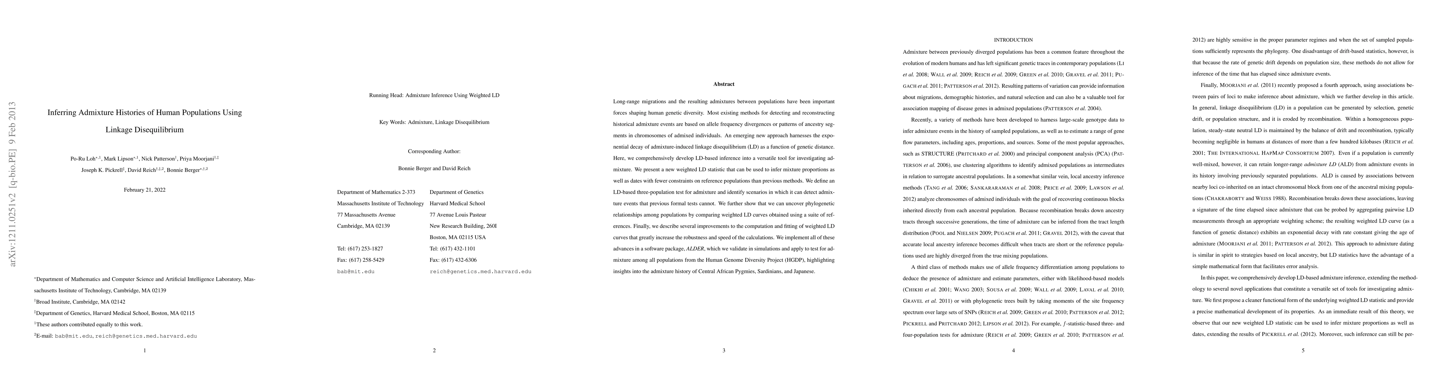 This paper develops a new method using admixture-induced linkage disequilibrium to infer historical admixture events in human populations, introducing a weighted LD statistic and a three-population test. It presents a software package, ALDER, validated through simulations and applied to HGDP data, revealing admixture histories of Central African Pygmies, Sardinians, and Japanese.