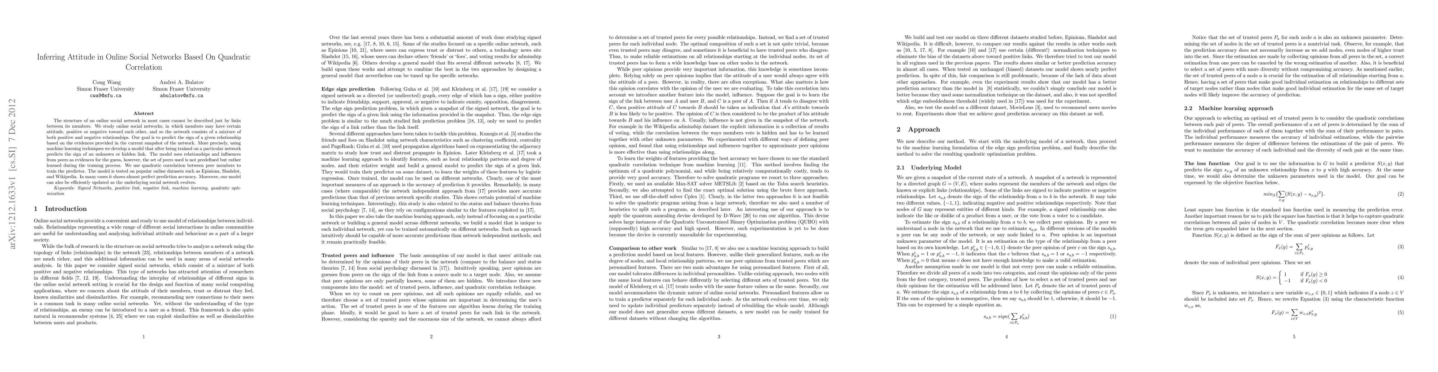 This research introduces a machine learning model to predict positive or negative attitudes in online social networks using quadratic correlation among peers' relationships. The model demonstrates high prediction accuracy on datasets like Epinions, Slashdot, and Wikipedia, and can adapt to network evolution.