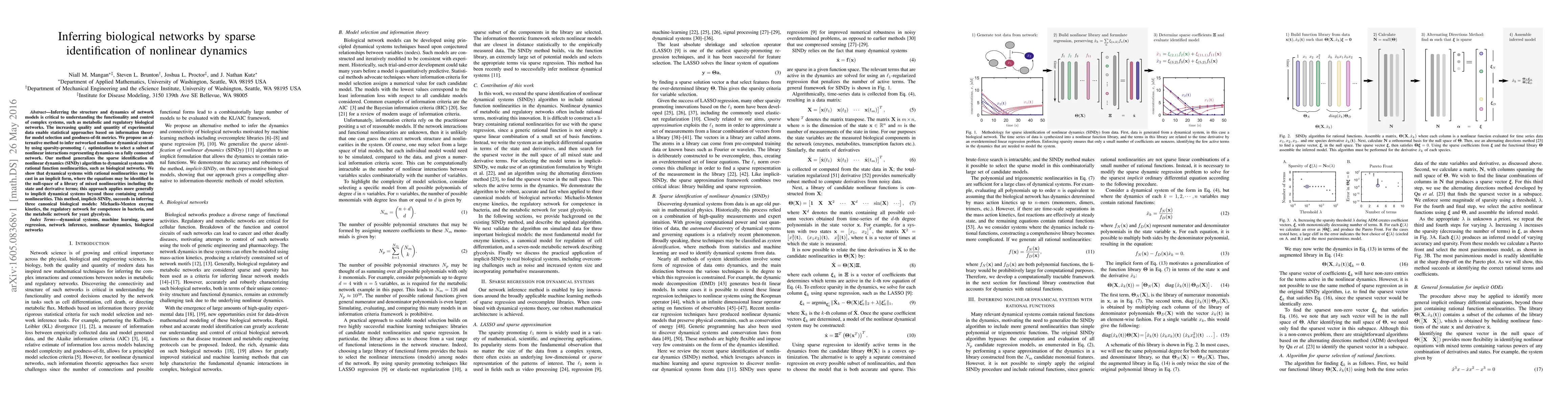This paper proposes a method called implicit-SINDy for inferring the structure and dynamics of networked nonlinear dynamical systems, particularly biological networks, using sparsity-promoting $\ell_1$ optimization to identify key interactions. The method generalizes the SINDy algorithm to systems with rational nonlinearities and successfully infers three canonical biological models.
