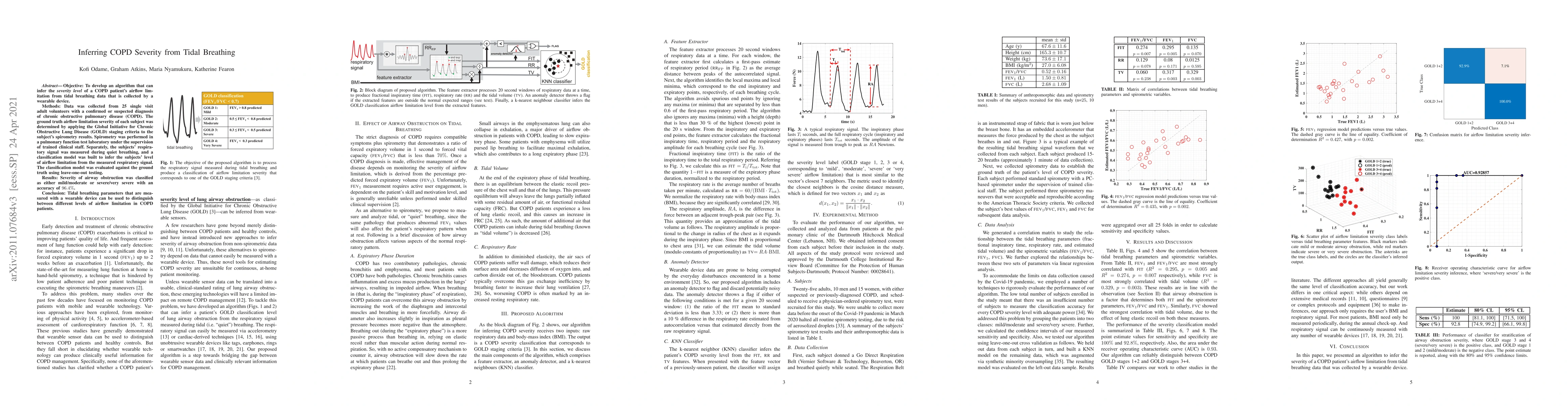 Objective: To develop an algorithm that can infer the severity level of a COPD patient's airflow limitation from tidal breathing data that is collected by a wearable device. Methods: Data was collected from 25 single visit adult volunteers with a confirmed or suspected diagnosis of chronic obstructive pulmonary disease (COPD). The ground truth airflow limitation severity of each subject was determined by applying the Global Initiative for Chronic Obstructive Lung Disease (GOLD) staging criteria to the subject's spirometry results. Spirometry was performed in a pulmonary function test laboratory under the supervision of trained clinical staff. Separately, the subjects' respiratory signal was measured during quiet breathing, and a classification model was built to infer the subjects' level of airflow limitation from the measured respiratory signal. The classification model was evaluated against the ground truth using leave-one-out testing. Results: Severity of airway obstruction was classified as either mild/moderate or severe/very severe with an accuracy of 96.4%. Conclusion: Tidal breathing parameters that are measured with a wearable device can be used to distinguish between different levels of airflow limitation in COPD patients.