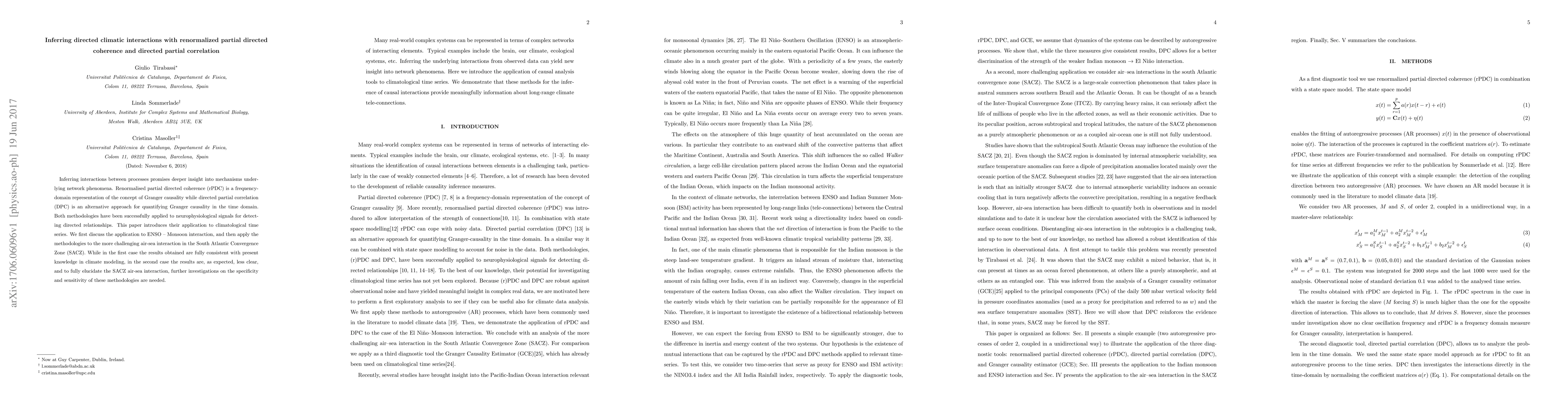 Inferring interactions between processes promises deeper insight into mechanisms underlying network phenomena. Renormalised partial directed coherence (rPDC) is a frequency-domain representation of the concept of Granger causality while directed partial correlation (DPC) is an alternative approach for quantifying Granger causality in the time domain. Both methodologies have been successfully applied to neurophysiological signals for detecting directed relationships. This paper introduces their application to climatological time series. We first discuss the application to ENSO -- Monsoon interaction, and then apply the methodologies to the more challenging air-sea interaction in the South Atlantic Convergence Zone (SACZ). While in the first case the results obtained are fully consistent with present knowledge in climate modeling, in the second case the results are, as expected, less clear, and to fully elucidate the SACZ air-sea interaction, further investigations on the specificity and sensitivity of these methodologies are needed.