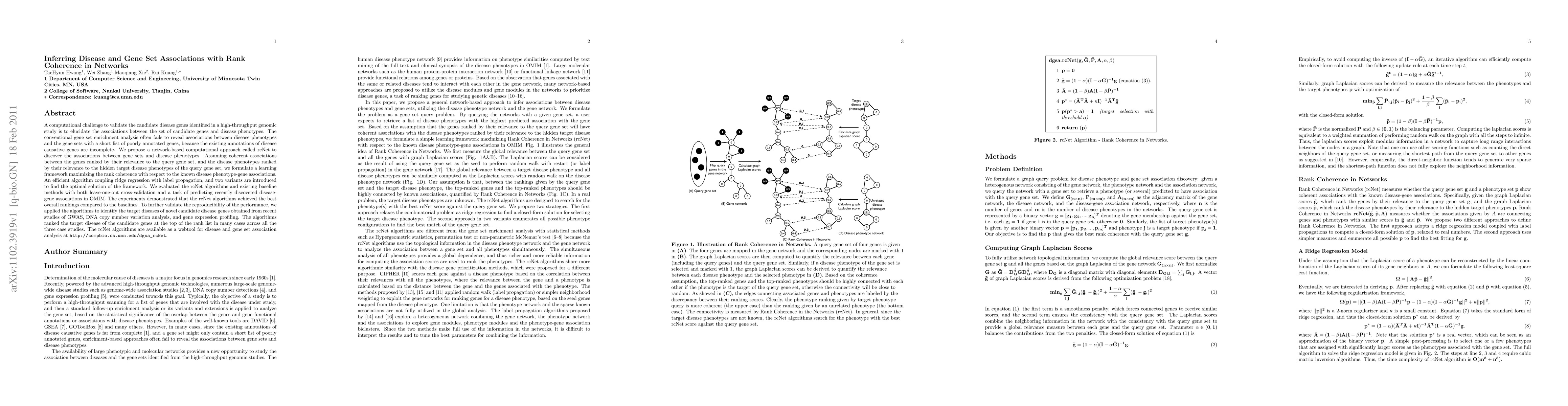 The paper introduces rcNet, a network-based computational approach to discover associations between gene sets and disease phenotypes, addressing the limitations of conventional gene set enrichment analysis. The proposed method uses rank coherence to achieve better predictions, demonstrated through experiments on various genomic datasets, outperforming existing baseline methods.