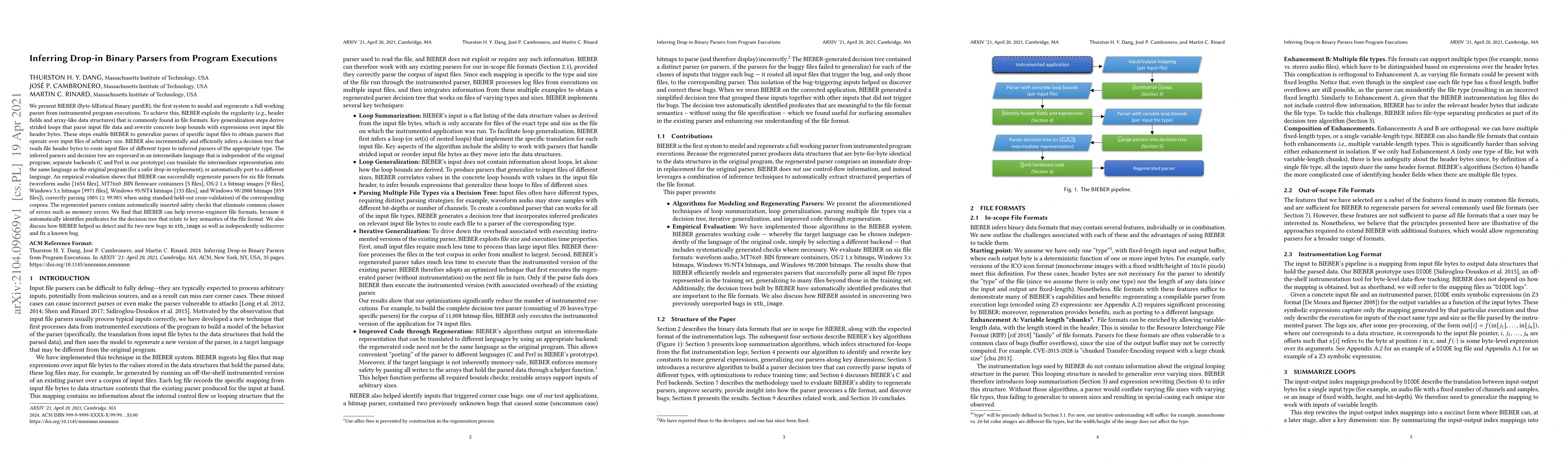 We present BIEBER (Byte-IdEntical Binary parsER), the first system to model and regenerate a full working parser from instrumented program executions. To achieve this, BIEBER exploits the regularity (e.g., header fields and array-like data structures) that is commonly found in file formats. Key generalization steps derive strided loops that parse input file data and rewrite concrete loop bounds with expressions over input file header bytes. These steps enable BIEBER to generalize parses of specific input files to obtain parsers that operate over input files of arbitrary size. BIEBER also incrementally and efficiently infers a decision tree that reads file header bytes to route input files of different types to inferred parsers of the appropriate type. The inferred parsers and decision tree are expressed in an IR; separate backends (C and Perl in our prototype) can translate the IR into the same language as the original program (for a safer drop-in replacement), or automatically port to a different language. An empirical evaluation shows that BIEBER can successfully regenerate parsers for six file formats (waveform audio [1654 files], MT76x0 .BIN firmware containers [5 files], OS/2 1.x bitmap images [9 files], Windows 3.x bitmaps [9971 files], Windows 95/NT4 bitmaps [133 files], and Windows 98/2000 bitmaps [859 files]), correctly parsing 100% (>= 99.98% when using standard held-out cross-validation) of the corresponding corpora. The regenerated parsers contain automatically inserted safety checks that eliminate common classes of errors such as memory errors. We find that BIEBER can help reverse-engineer file formats, because it automatically identifies predicates for the decision tree that relate to key semantics of the file format. We also discuss how BIEBER helped us detect and fix two new bugs in stb_image as well as independently rediscover and fix a known bug.