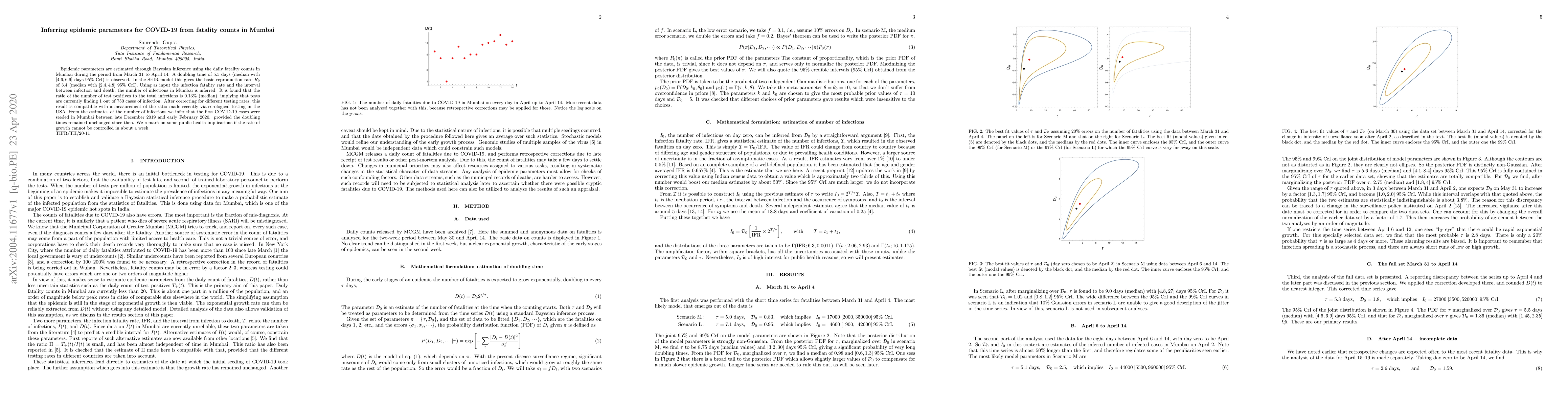 Epidemic parameters are estimated through Bayesian inference using the daily fatality counts in Mumbai during the period from March 31 to April 14. A doubling time of 5.5 days (median with 95% CrI of 4.6-6.9 days) is observed. In the SEIR model this gives the basic reproduction rate R_0 of 3.4 (median with 95% CrI of 2.4-4.8). Using as input the infection fatality rate and the interval between infection and death, the number of infections in Mumbai is inferred. It is found that the ratio of the number of test positives to the total infections is 0.13\% (median), implying that tests are currently finding 1 out of 750 cases of infection. After correcting for different testing rates, this result is compatible with a measurement of the ratio made recently via serological testing in the USA. From the estimates of the number of infections we infer that the first COVID-19 cases were seeded in Mumbai between late December 2019 and early February 2020. provided the doubling times remained unchanged since then. We remark on some public health implications if the rate of growth cannot be controlled in about a week.