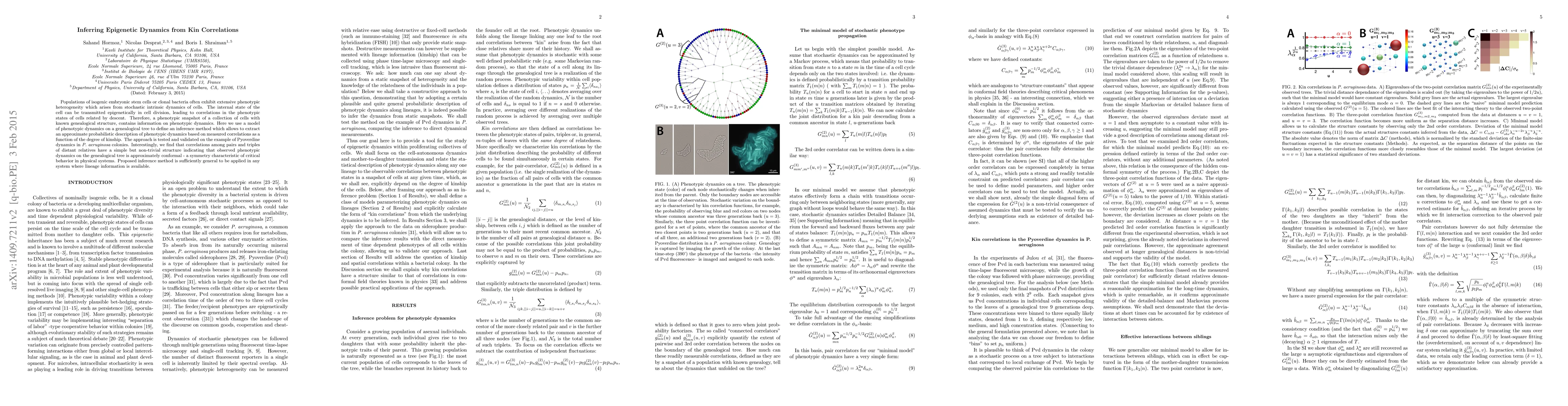 Populations of isogenic embryonic stem cells or clonal bacteria often exhibit extensive phenotypic heterogeneity which arises from stochastic intrinsic dynamics of cells. The internal state of the cell can be transmitted epigenetically in cell division, leading to correlations in the phenotypic states of cells related by descent. Therefore, a phenotypic snapshot of a collection of cells with known genealogical structure, contains information on phenotypic dynamics. Here we use a model of phenotypic dynamics on a genealogical tree to define an inference method which allows to extract an approximate probabilistic description of phenotypic dynamics based on measured correlations as a function of the degree of kinship. The approach is tested and validated on the example of Pyoverdine dynamics in P. aeruginosa colonies. Interestingly, we find that correlations among pairs and triples of distant relatives have a simple but non-trivial structure indicating that observed phenotypic dynamics on the genealogical tree is approximately conformal - a symmetry characteristic of critical behavior in physical systems. Proposed inference method is sufficiently general to be applied in any system where lineage information is available.