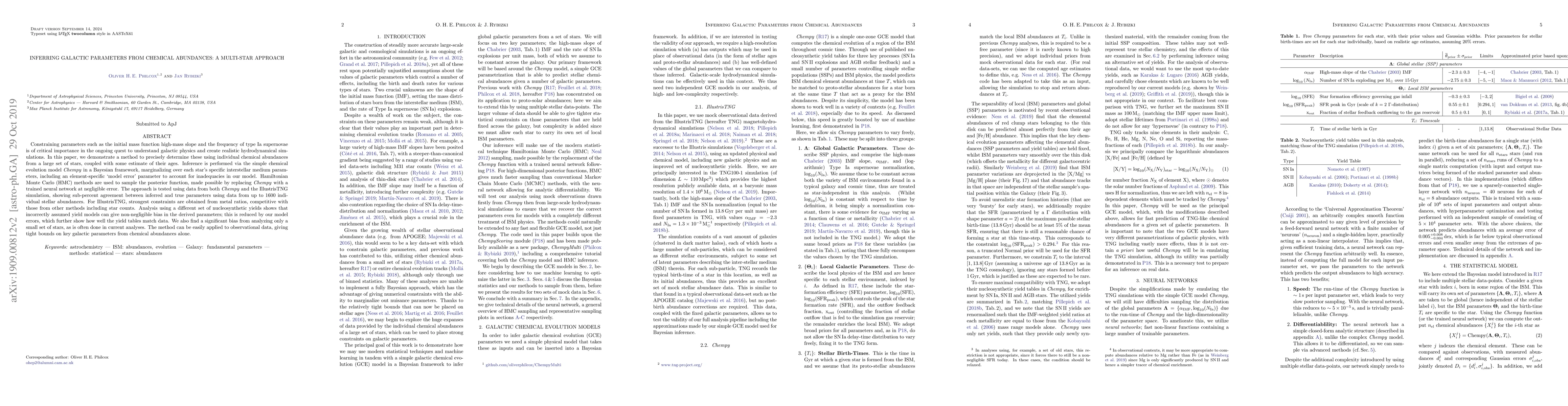 Constraining parameters such as the initial mass function high-mass slope and the frequency of type Ia supernovae is of critical importance in the ongoing quest to understand galactic physics and create realistic hydrodynamical simulations. In this paper, we demonstrate a method to precisely determine these using individual chemical abundances from a large set of stars, coupled with some estimate of their ages. Inference is performed via the simple chemical evolution model Chempy in a Bayesian framework, marginalizing over each star's specific interstellar medium parameters, including an element-specific `model error' parameter to account for inadequacies in our model. Hamiltonian Monte Carlo (HMC) methods are used to sample the posterior function, made possible by replacing Chempy with a trained neural network at negligible error. The approach is tested using data from both Chempy and the IllustrisTNG simulation, showing sub-percent agreement between inferred and true parameters using data from up to 1600 individual stellar abundances. For IllustrisTNG, strongest constraints are obtained from metal ratios, competitive with those from other methods including star counts. Analysis using a different set of nucleosynthetic yields shows that incorrectly assumed yield models can give non-negligible bias in the derived parameters; this is reduced by our model errors, which further show how well the yield tables match data. We also find a significant bias from analyzing only a small set of stars, as is often done in current analyses. The method can be easily applied to observational data, giving tight bounds on key galactic parameters from chemical abundances alone.