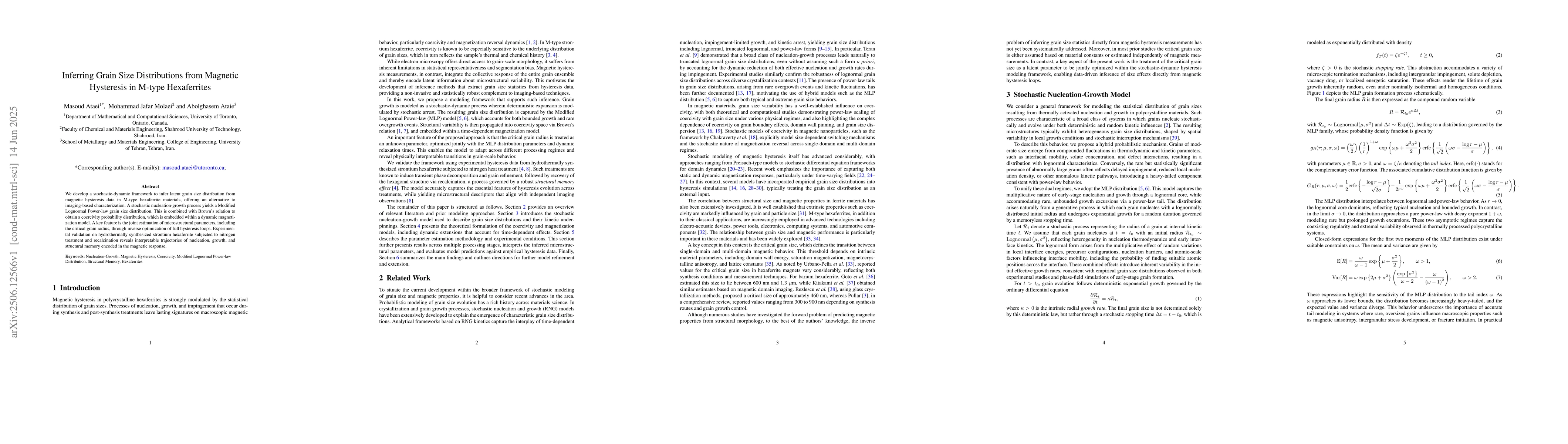 This research introduces a novel method using magnetic hysteresis data to infer grain size distribution in M-type hexaferrite materials, bypassing traditional imaging techniques. The approach combines stochastic nucleation-growth models, Brown's relation, and dynamic magnetization modeling to estimate microstructural parameters, validated experimentally on nitrogen-treated strontium hexaferrite, demonstrating the encoding of microstructural evolution in magnetic response.