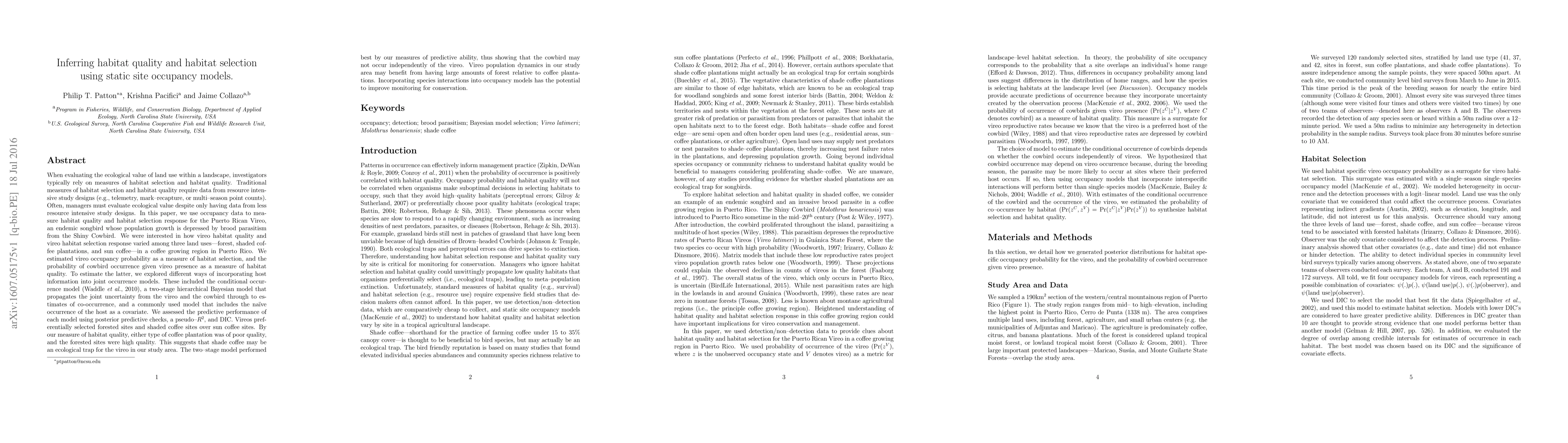 This paper uses occupancy models to infer habitat quality and selection for the Puerto Rican Vireo, comparing three land uses in Puerto Rico. It finds that vireos prefer forested and shaded coffee sites over sun coffee sites, suggesting that shaded coffee may act as an ecological trap, while large forest areas may benefit vireo population dynamics.