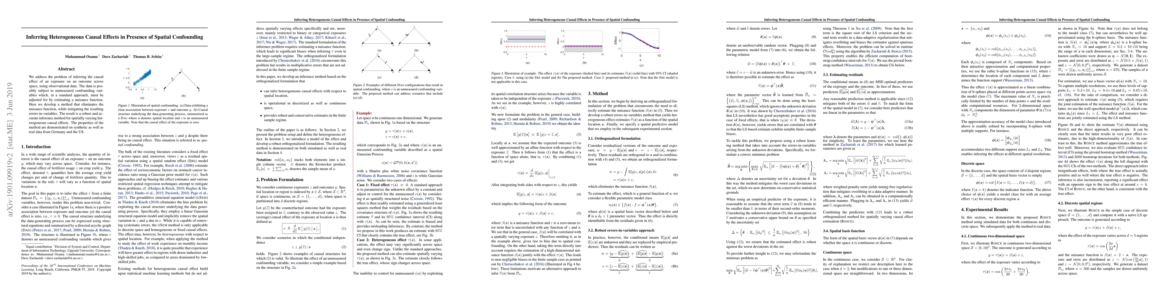 We address the problem of inferring the causal effect of an exposure on an outcome across space, using observational data. The data is possibly subject to unmeasured confounding variables which, in a standard approach, must be adjusted for by estimating a nuisance function. Here we develop a method that eliminates the nuisance function, while mitigating the resulting errors-in-variables. The result is a robust and accurate inference method for spatially varying heterogeneous causal effects. The properties of the method are demonstrated on synthetic as well as real data from Germany and the US.