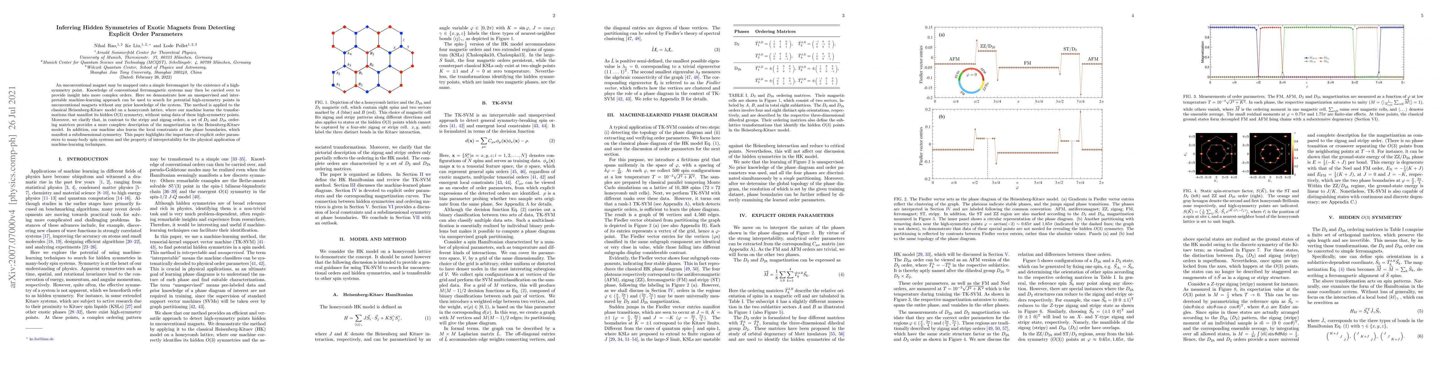 An unconventional magnet may be mapped onto a simple ferromagnet by the existence of a high-symmetry point. Knowledge of conventional ferromagnetic systems may then be carried over to provide insight into more complex orders. Here we demonstrate how an unsupervised and interpretable machine-learning approach can be used to search for potential high-symmetry points in unconventional magnets without any prior knowledge of the system. The method is applied to the classical Heisenberg-Kitaev model on a honeycomb lattice, where our machine learns the transformations that manifest its hidden $O(3)$ symmetry, without using data of these high-symmetry points. Moreover, we clarify that, in contrast to the stripy and zigzag orders, a set of $D_2$ and $D_{2h}$ ordering matrices provides a more complete description of the magnetization in the Heisenberg-Kitaev model. In addition, our machine also learns the local constraints at the phase boundaries, which manifest a subdimensional symmetry. This paper highlights the importance of explicit order parameters to many-body spin systems and the property of interpretability for the physical application of machine-learning techniques.