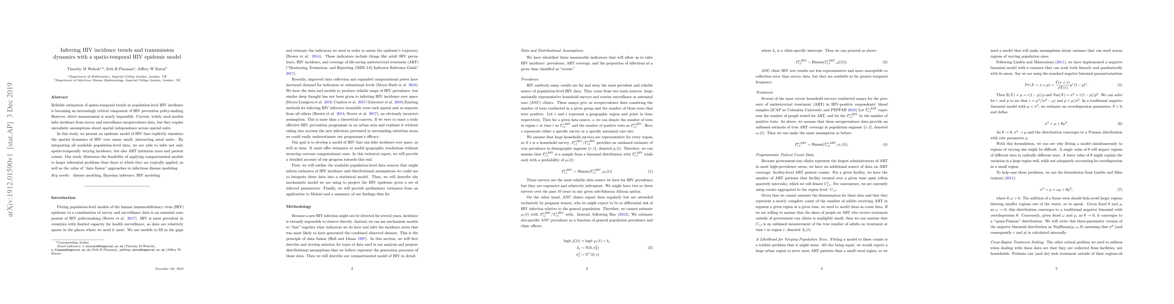This study develops a spatio-temporal HIV epidemic model to infer HIV incidence trends and transmission dynamics, overcoming limitations of existing models by simulating spatial interactions across small areas. The model integrates diverse population-level data to estimate incidence, ART initiation rates, and patient counts, demonstrating the potential of data fusion in infectious disease modeling.