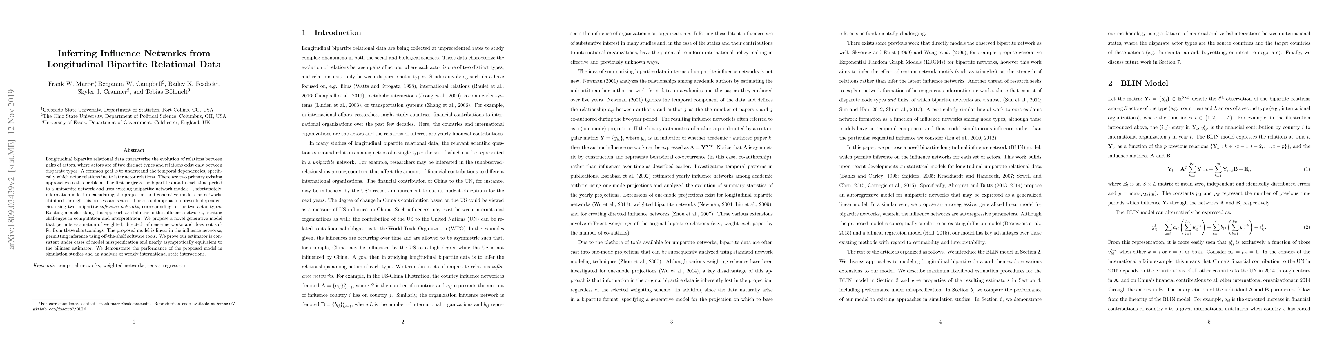 This paper proposes a novel generative model for inferring influence networks from longitudinal bipartite relational data, addressing limitations of existing approaches and providing a linear and interpretable solution.