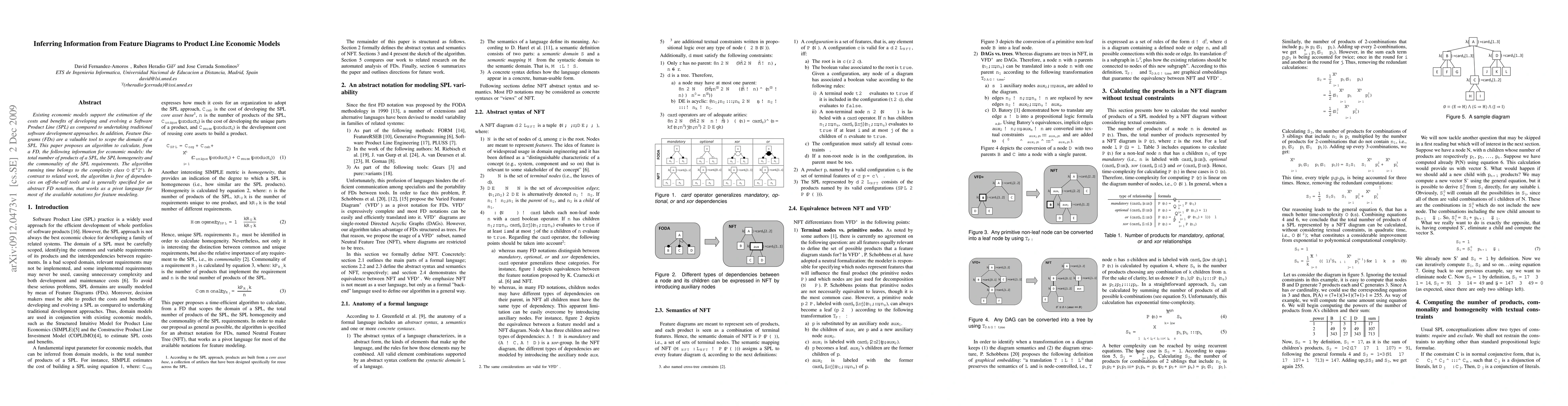 Existing economic models support the estimation of the costs and benefits of developing and evolving a Software Product Line (SPL) as compared to undertaking traditional software development approaches. In addition, Feature Diagrams (FDs) are a valuable tool to scope the domain of a SPL. This paper proposes an algorithm to calculate, from a FD, the following information for economic models: the total number of products of a SPL, the SPL homogeneity and the commonality of the SPL requirements. The algorithm running time belongs to the complexity class $O(f^42^c)$. In contrast to related work, the algorithm is free of dependencies on off-the-self tools and is generally specified for an abstract FD notation, that works as a pivot language for most of the available notations for feature modeling.