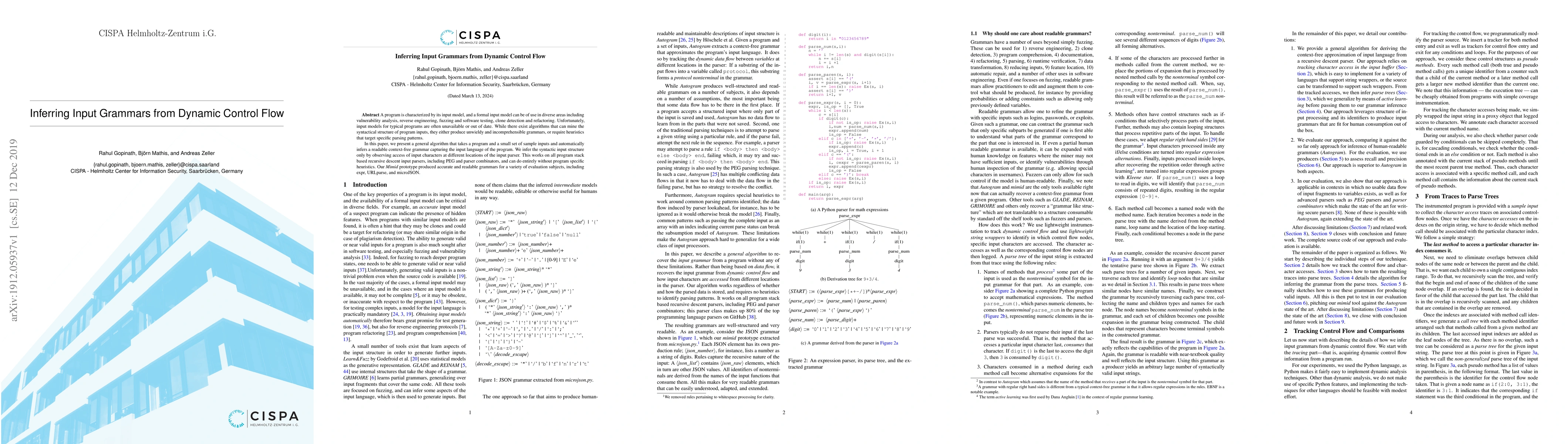 This paper introduces an algorithm for inferring readable context-free grammars from dynamic control flow, enabling applications in vulnerability analysis and software testing. The algorithm observes input parsing behavior to infer the input language without requiring specific heuristics, demonstrating accuracy on various parsers.