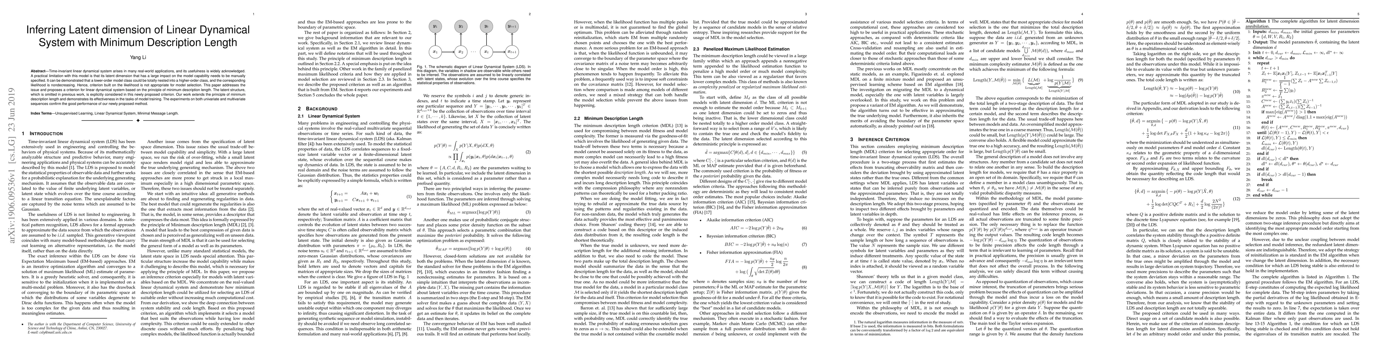Time-invariant linear dynamical system arises in many real-world applications,and its usefulness is widely acknowledged. A practical limitation with this model is that its latent dimension that has a large impact on the model capability needs to be manually specified. It can be demonstrated that a lower-order model class could be totally nested into a higher-order class, and the corresponding likelihood is nondecreasing. Hence, criterion built on the likelihood is not appropriate for model selection. This paper addresses the issue and proposes a criterion for linear dynamical system based on the principle of minimum description length. The latent structure, which is omitted in previous work, is explicitly considered in this newly proposed criterion. Our work extends the principle of minimum description length and demonstrates its effectiveness in the tasks of model training. The experiments on both univariate and multivariate sequences confirm the good performance of our newly proposed method.