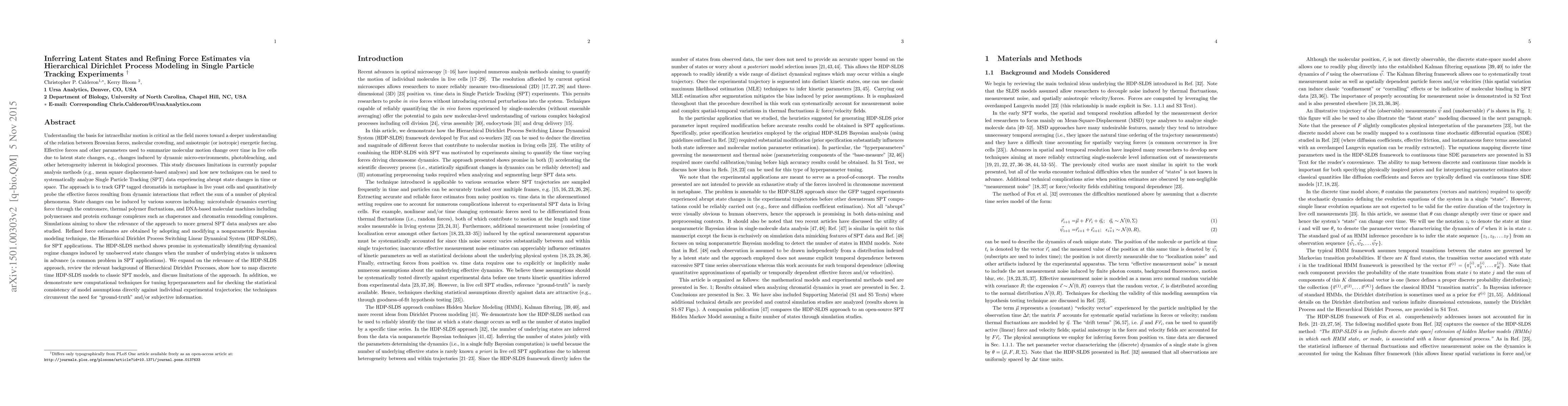 Optical microscopy provides rich spatio-temporal information characterizing in vivo molecular motion. However, effective forces and other parameters used to summarize molecular motion change over time in live cells due to latent state changes, e.g., changes induced by dynamic micro-environments, photobleaching, and other heterogeneity inherent in biological processes. This study focuses on techniques for analyzing Single Particle Tracking (SPT) data experiencing abrupt state changes. We demonstrate the approach on GFP tagged chromatids experiencing metaphase in yeast cells and probe the effective forces resulting from dynamic interactions that reflect the sum of a number of physical phenomena. State changes are induced by factors such as microtubule dynamics exerting force through the centromere, thermal polymer fluctuations, etc. Simulations are used to demonstrate the relevance of the approach in more general SPT data analyses. Refined force estimates are obtained by adopting and modifying a nonparametric Bayesian modeling technique, the Hierarchical Dirichlet Process Switching Linear Dynamical System (HDP-SLDS), for SPT applications. The HDP-SLDS method shows promise in systematically identifying dynamical regime changes induced by unobserved state changes when the number of underlying states is unknown in advance (a common problem in SPT applications). We expand on the relevance of the HDP-SLDS approach, review the relevant background of Hierarchical Dirichlet Processes, show how to map discrete time HDP-SLDS models to classic SPT models, and discuss limitations of the approach. In addition, we demonstrate new computational techniques for tuning hyperparameters and for checking the statistical consistency of model assumptions directly against individual experimental trajectories; the techniques circumvent the need for "ground-truth" and subjective information.