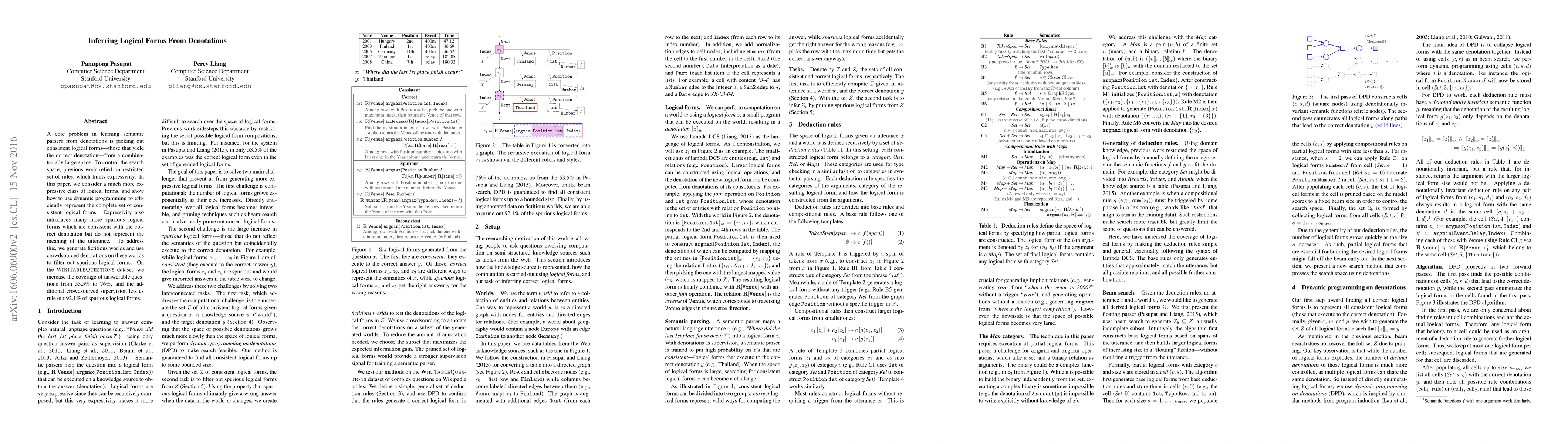 This paper proposes a method to infer highly expressive logical forms from denotations using dynamic programming, addressing the challenge of finding consistent forms within a large search space. It employs crowdsourced denotations from fictitious worlds to filter out irrelevant forms, resulting in a significant increase in the coverage of answerable questions on the WikiTableQuestions dataset.