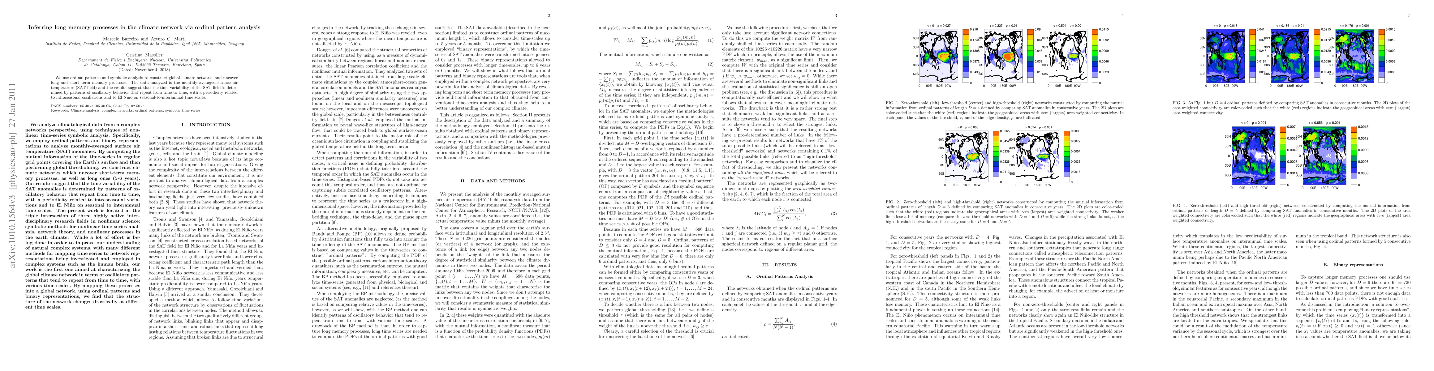 We use ordinal patterns and symbolic analysis to construct global climate networks and uncover long and short term memory processes. The data analyzed is the monthly averaged surface air temperature (SAT field) and the results suggest that the time variability of the SAT field is determined by patterns of oscillatory behavior that repeat from time to time, with a periodicity related to intraseasonal oscillations and to El Ni\~{n}o on seasonal-to-interannual time scales.