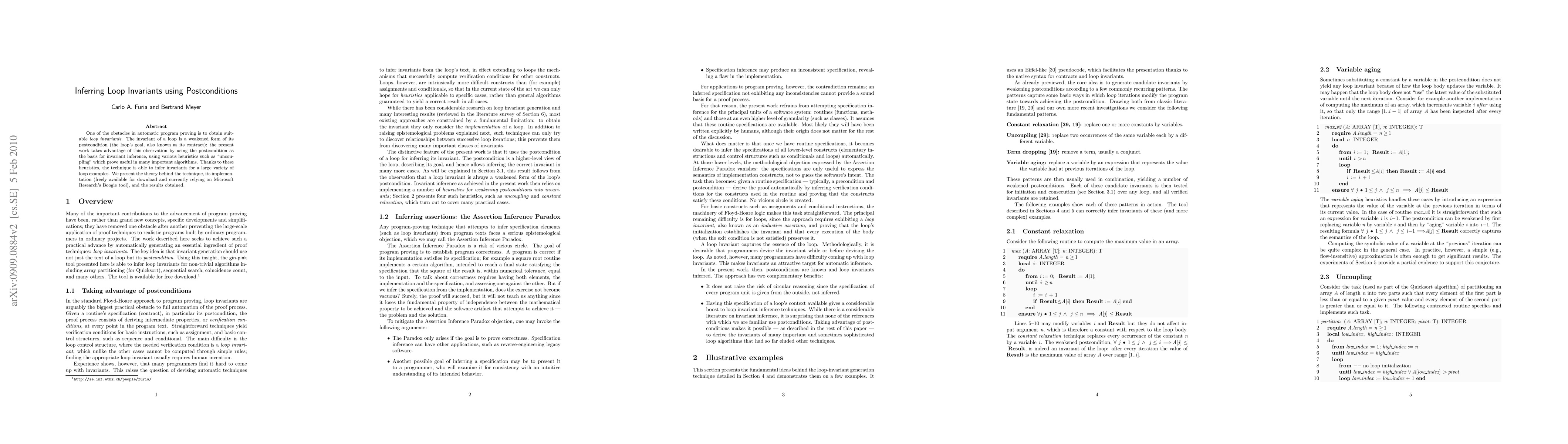 This paper proposes a method to infer loop invariants by leveraging the loop's postcondition, employing heuristics like "uncoupling" to handle a wide range of loops. The technique is implemented in Microsoft Research's Boogie tool and demonstrates successful invariant inference across various examples.