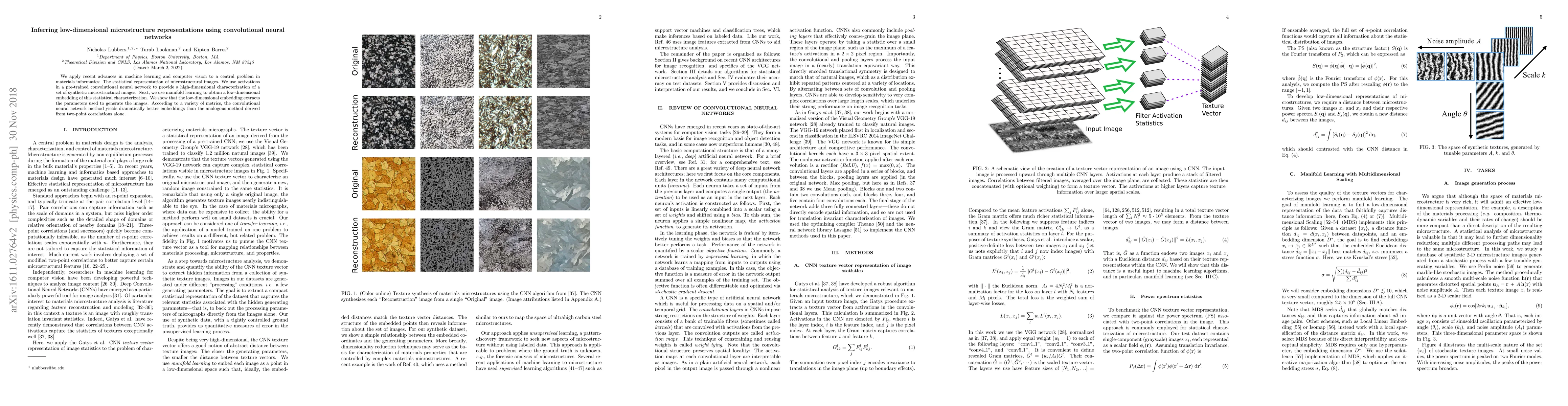 This paper employs convolutional neural networks to characterize synthetic microstructural images, using manifold learning to derive low-dimensional embeddings that accurately capture the image generation parameters, outperforming traditional two-point correlation methods.