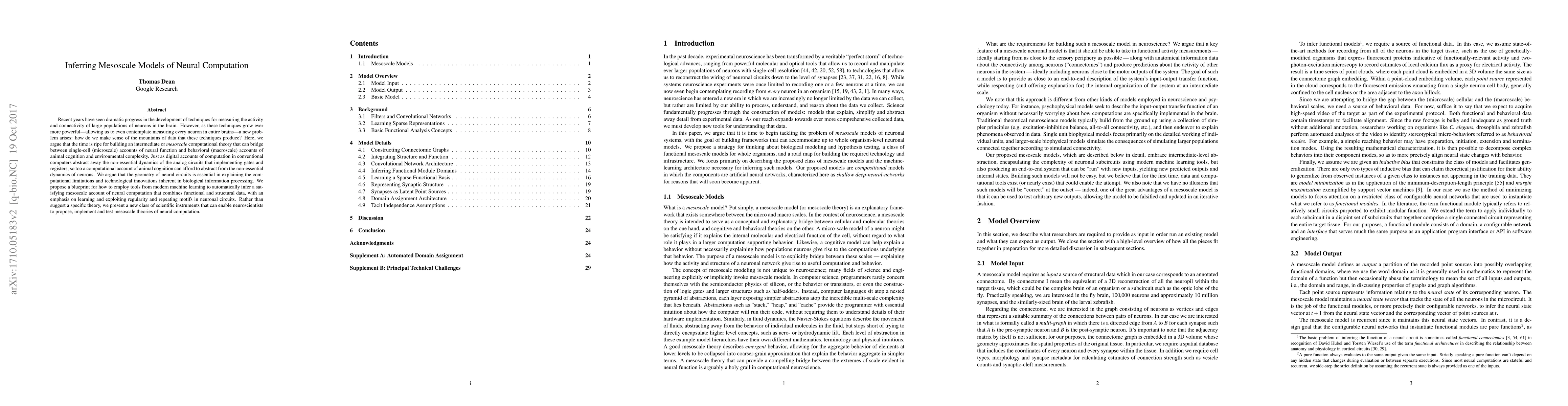 The paper proposes the development of mesoscale computational models for understanding neural computation, bridging microscale neuronal activity and macroscale behavior. It suggests using machine learning tools to infer these models from functional and structural neuronal circuit data, focusing on repeating motifs, to create testable theories of brain function.