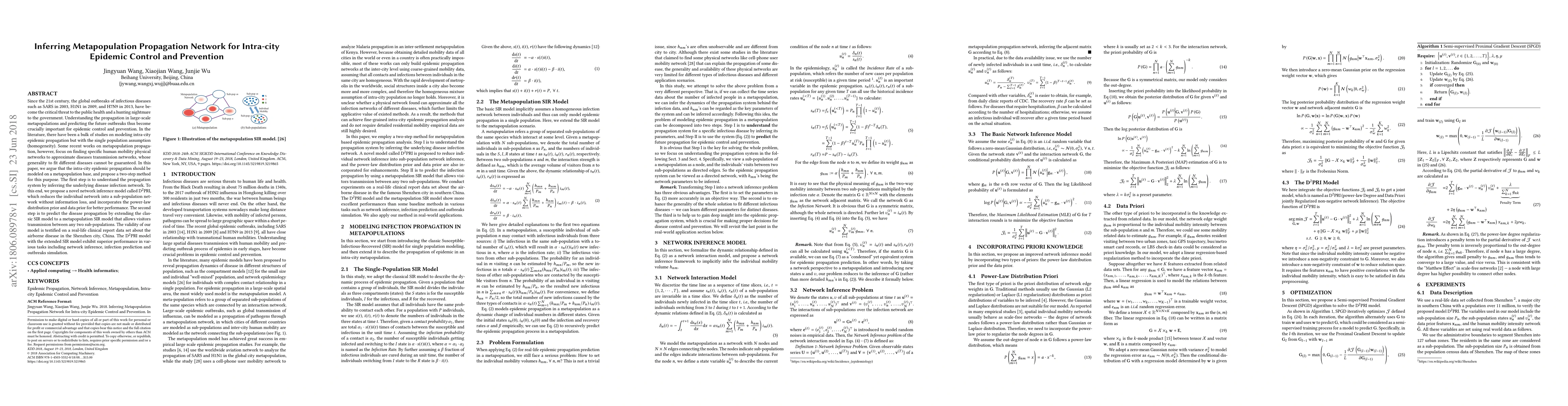 This paper proposes a two-step method to model intra-city epidemic propagation based on metapopulation networks. The D$^2$PRI model infers the underlying disease infection network, while the extended metapopulation SIR model predicts disease spread, demonstrating superior performance in network inference, infection prediction, and outbreak simulation using real-life data from Shenzhen, China.