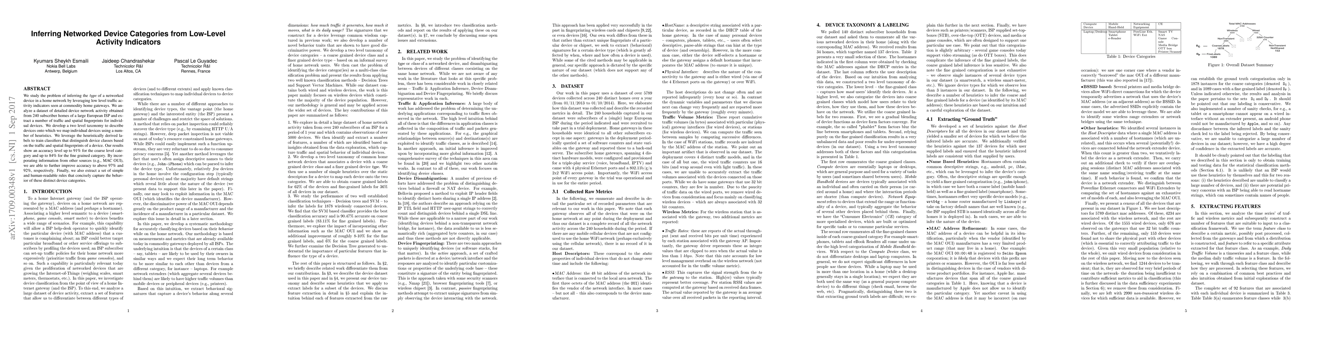 This research infers network device types in home networks using low-level traffic indicators from a dataset of 240 European ISP subscriber homes. A two-level taxonomy and heuristics classify devices with up to 91% accuracy for coarse categories and 84% for fine-grained ones. Accuracy improves to over 97% with additional data like MAC OUI. The study also extracts human-readable rules describing device behaviors.