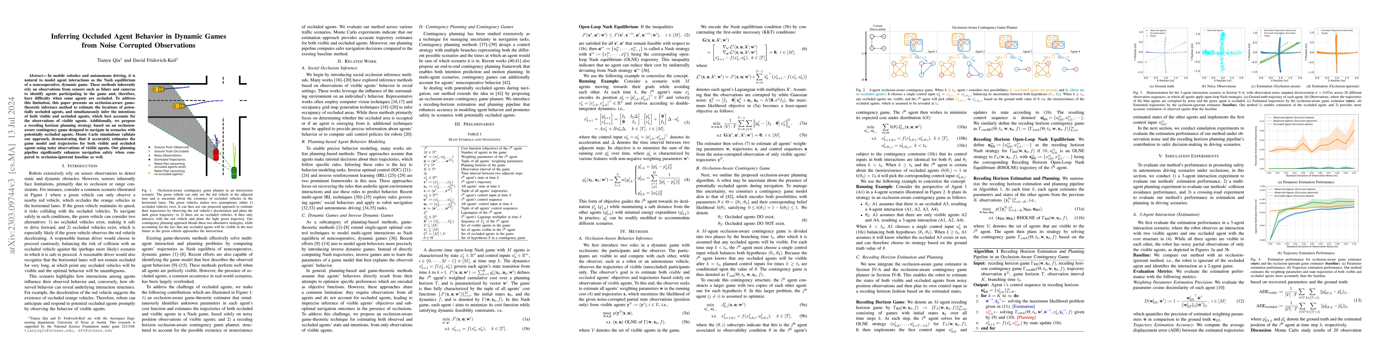 This paper proposes an inverse dynamic game technique to infer the behavior of occluded agents in multi-agent scenarios, optimizing the game model to explain visible agents' observations. The approach also predicts future behaviors and employs a receding horizon planning pipeline, demonstrating robust estimation and safer navigation compared to baseline methods.