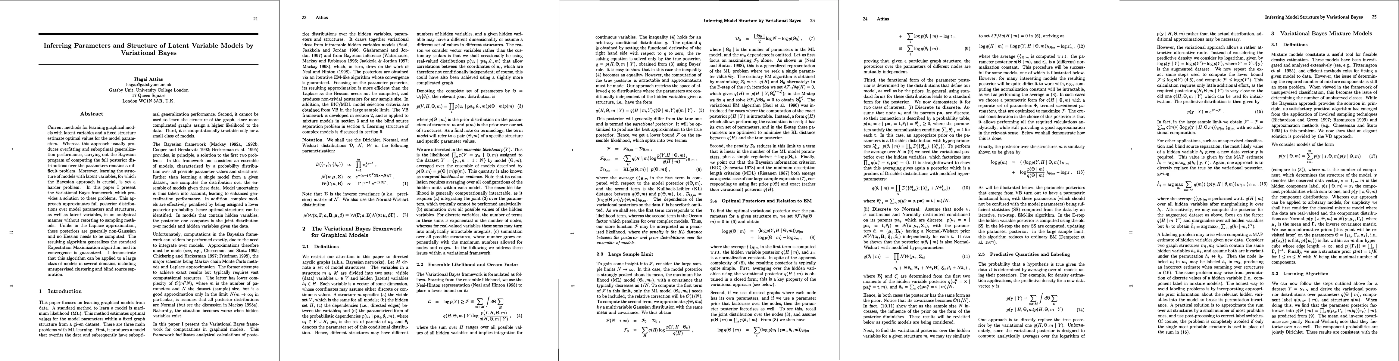 This paper introduces the Variational Bayes framework to infer parameters and structures in latent variable models, offering an analytical solution to approximate full posterior distributions without overfitting. The proposed method generalizes the Expectation Maximization algorithm and demonstrates applicability across various domains like clustering and source separation.